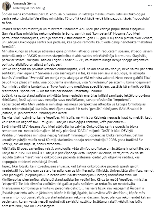 Jautājums par finansējuma piešķiršanu Rīgas Austrumu klīniskās universitātes slimnīcas (RAKUS) Latvijas Onkoloģijas centra (LOC) rekonstrukcijai joprojām ir iestrēdzis, pauž LOC Onkoķirurģijas klīnikas vadītājs Armands Sīviņš, kura skatījumā, izšķirošie lēmumi par projekta virzību ir Veselības ministrijas (VM) kompetencē. Pēc viņa teiktā, situācija ir nemainīga - arī jaunākajā VM piedāvātajā risinājumā pagaidām LOC rekonstrukcijai nav paredzēts konkrēts finansējuma avots. Sīviņš uzskata, ka slimnīcai pašai nevajadzētu meklēt finanšu avotus šim mērķim. "Bumba ir ministrijas pusē," domā ārsts.