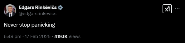 “Never stop panicking” jeb no angļu valodas tulkojot – “nekad nepārstājiet krist panikā” – šāds Valsts prezidenta Edgara Rinkēviča ieraksts sociālajos tīklos pirmdienas vakarā samulsinājis ne vienu vien.