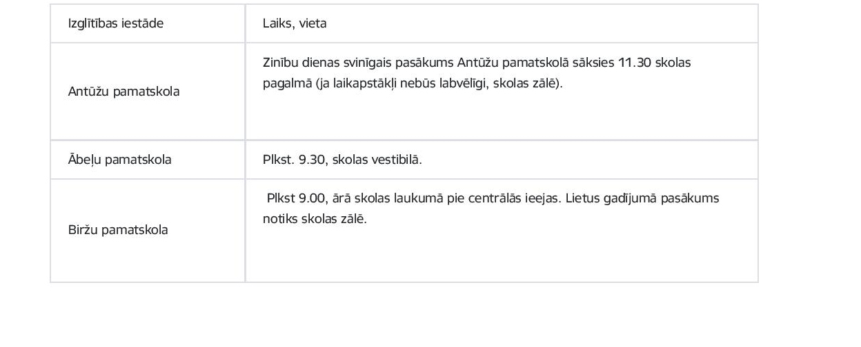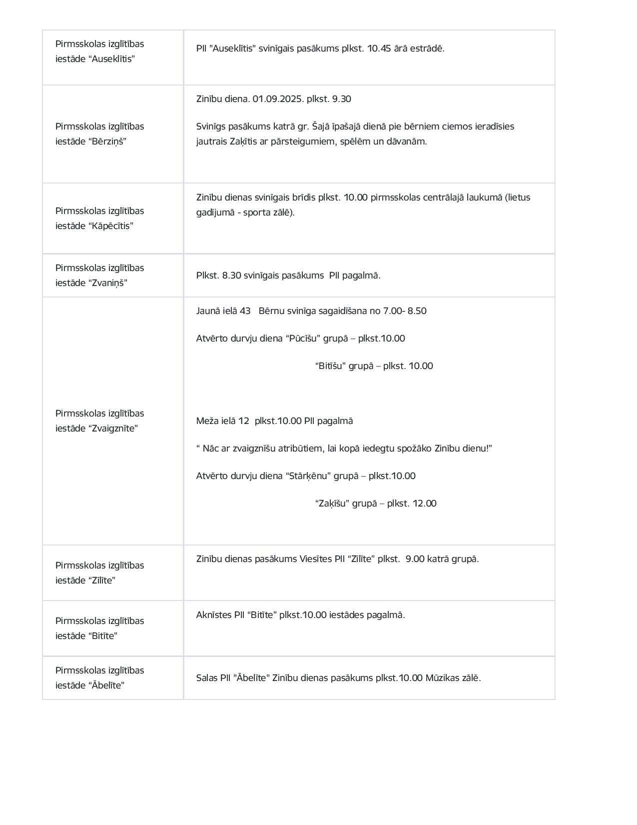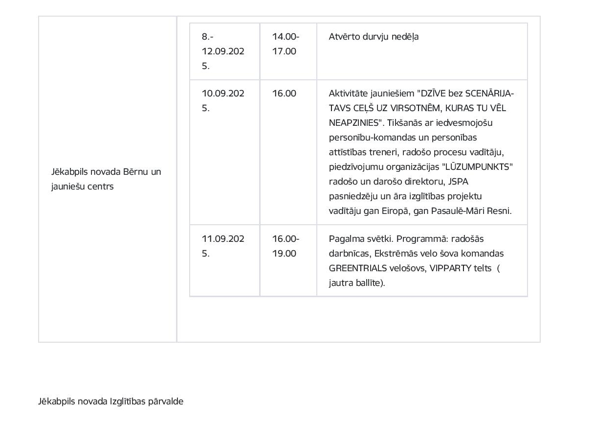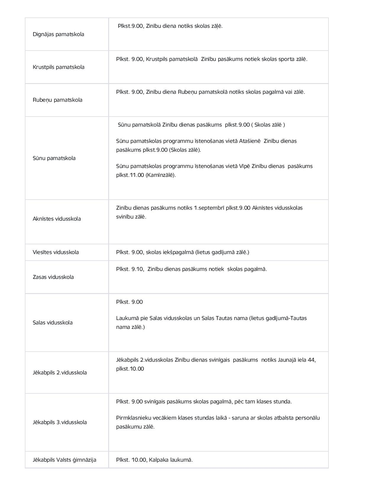 Apkopota informācija par Zinību dienas svinīgajiem pasākumiem Jēkabpils novada izglītības iestādēs. Gandrīz visās skolās un bērnudārzos jaunā mācību gada sākums tiks atzīmēts 1. septembrī. Vienīgi Jēkabpils novada Bērnu un jauniešu centrs pasākumus plāno vēlāk – no 8. līdz 12. septembrim.