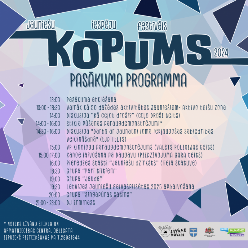 Jauniešu festivāls “Kopums” pulcēs jauniešus no visas Latvijas. Ikvienam visas dienas garumā būs iespēja piedalīties vairāk nekā 50 aktivitātēs, bet vakarā ar muzikāliem priekšnesumiem priecēs grupas “Pāri tiltiem”, “Jauda” un “Singapūras Satīns”.