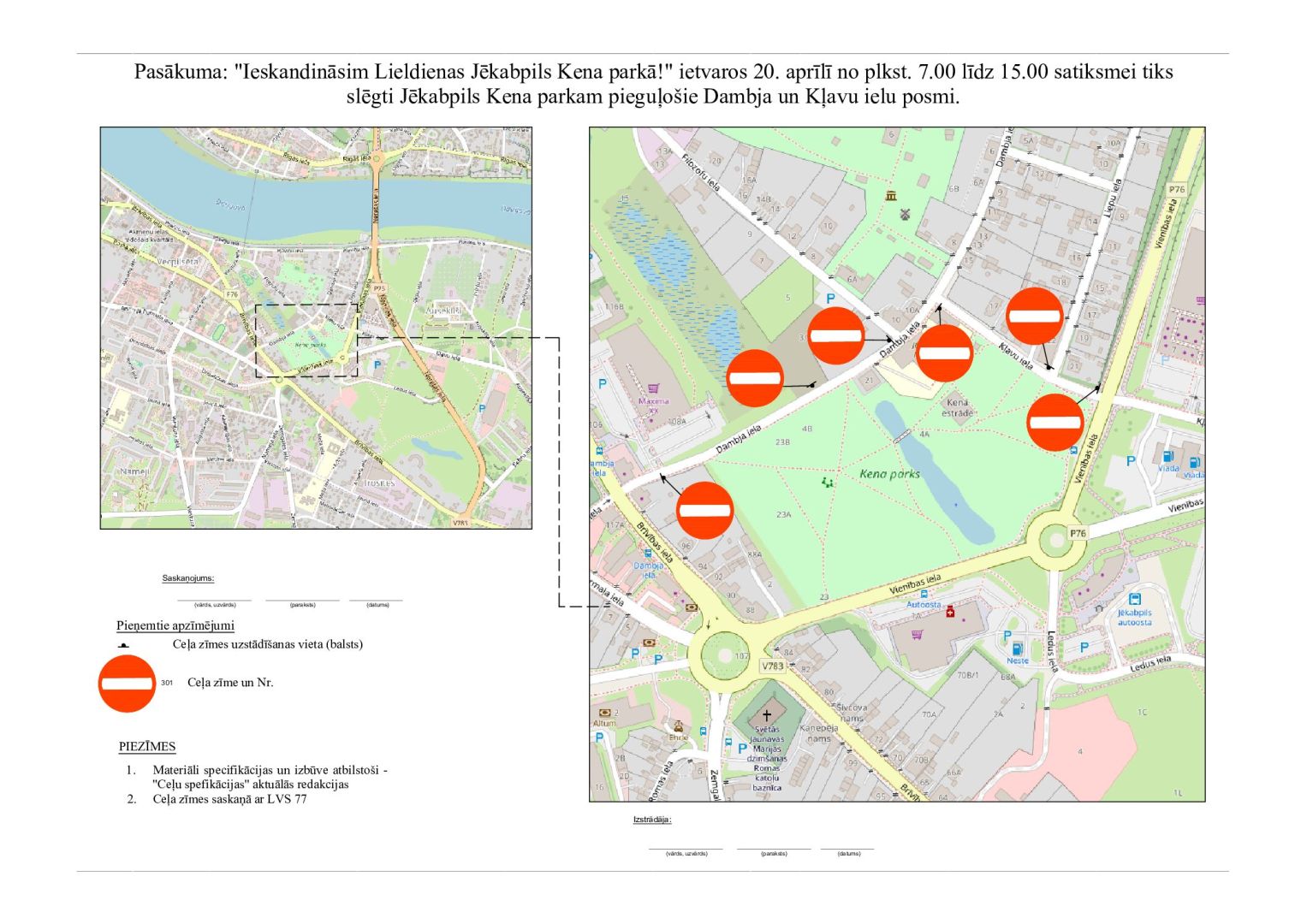 20.aprīlī laikā no pulksten 7.00 līdz 15.00 satiksmei tiks slēgti Jēkabpils Kena parkam pieguļošie Dambja un Kļavu ielas posmi pasākuma “Ieskandināsim Lieldienas Jēkabpils Kena parkā!” laikā.