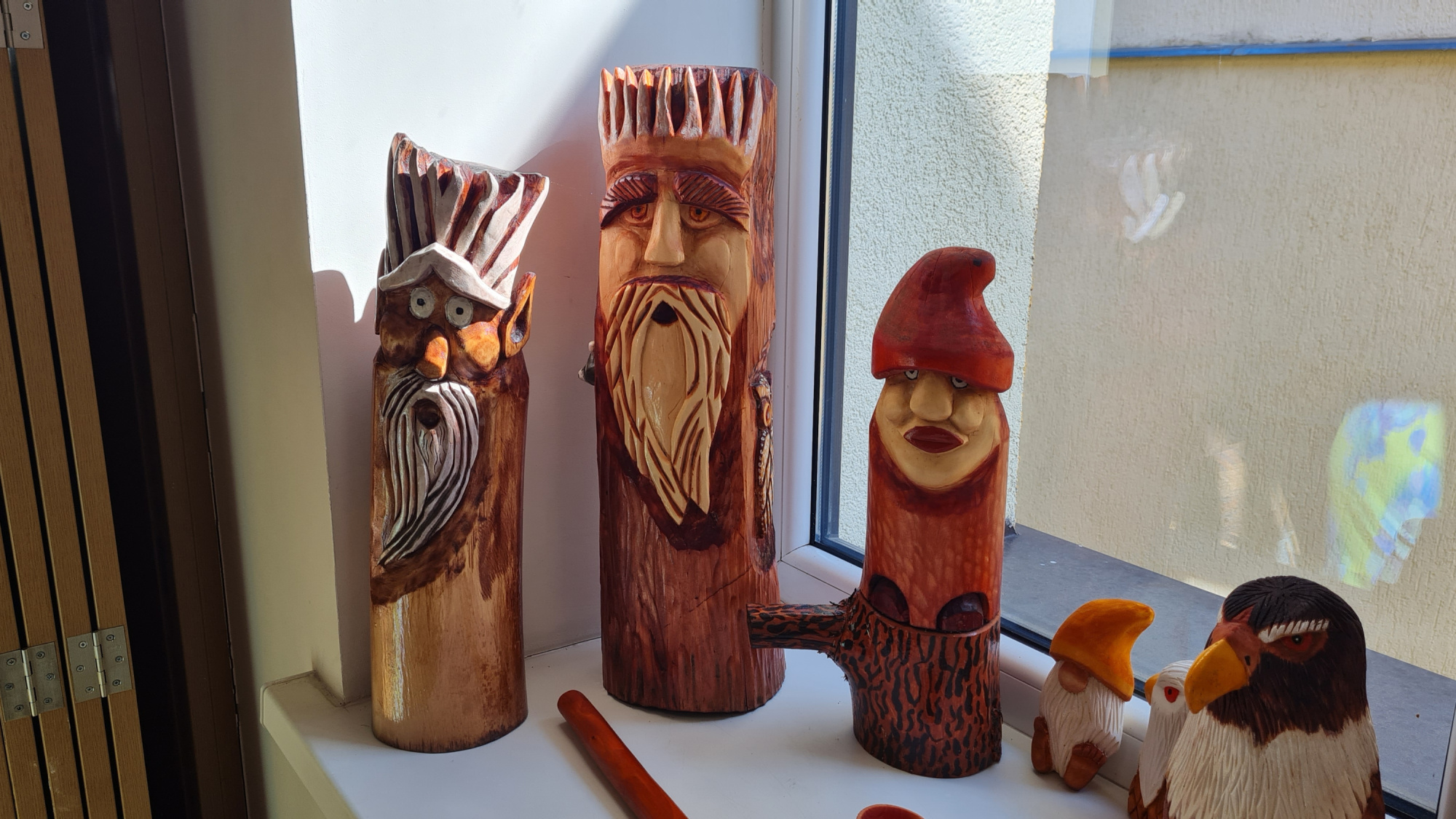 “Tā ir karote, lai notievētu,” par savu darinājumu stāsta izstādes dalībnieks Jānis. “Nevar pasmelt, arī žests tāds. Tas tāds humors, bet cilvēkiem patīk. Parasti uz mežu aizbraucu, apsēžos un tur strādāju.”