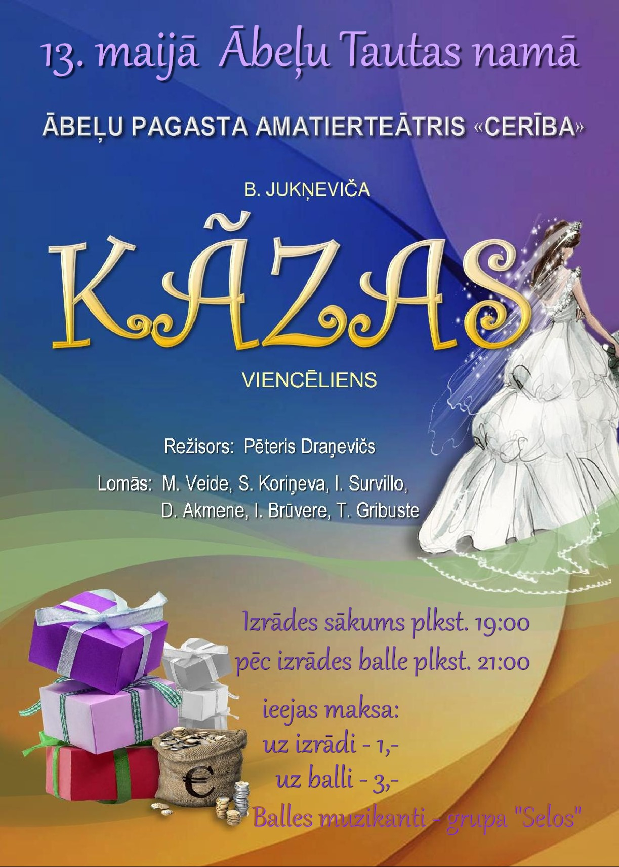To, vai kāzas beigu beigās būs vai nebūs, varēs uzzināt, noskatoties Ābeļu amatierteātra “Cerība” jauno iestudējumu. Pirmizrāde būs jau pavisam drīz – 13.maijā pl.19:00 Ābeļu Tautas namā. Pielikumā – afiša.