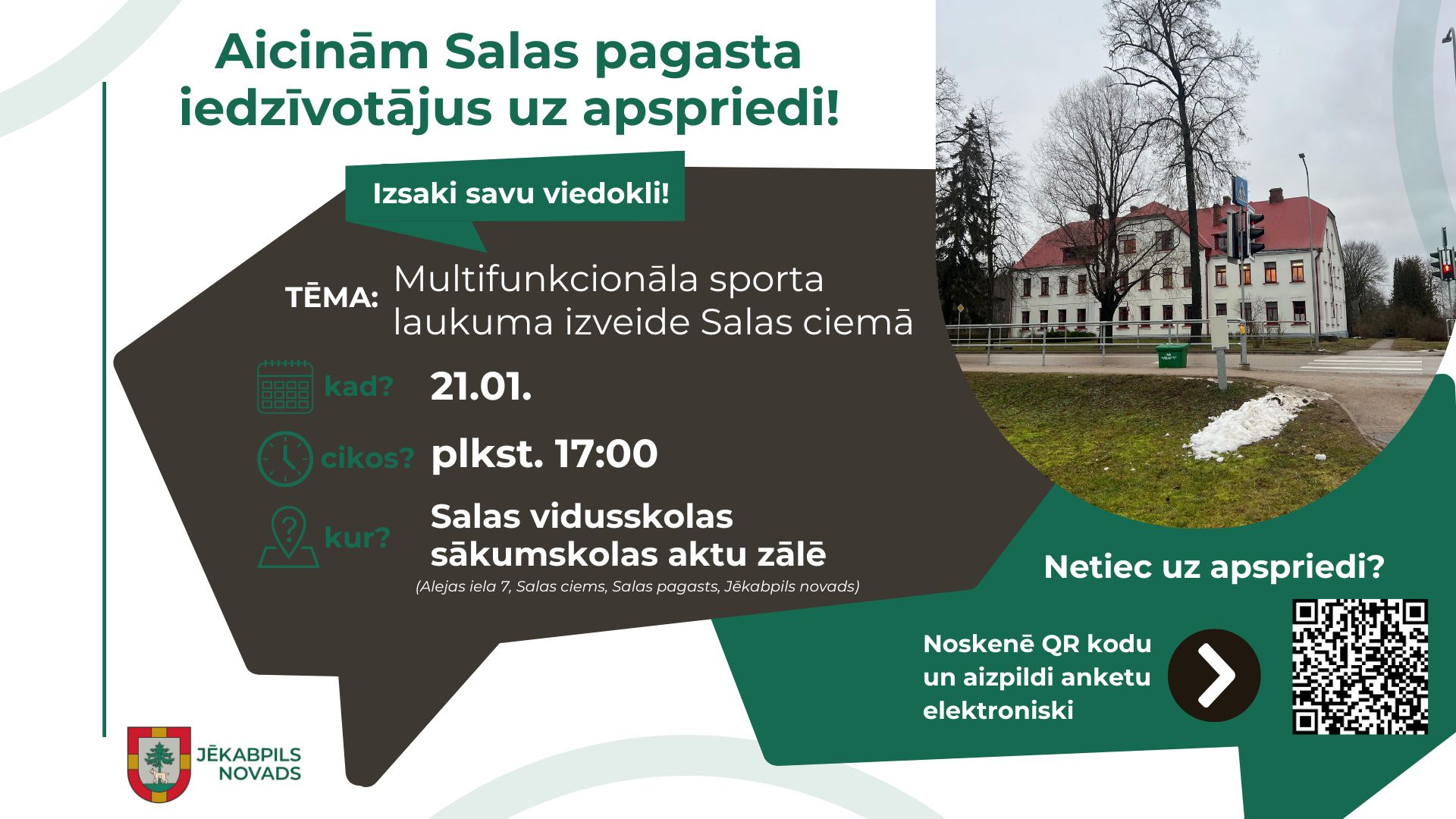 Jēkabpils novada Salas iedzīvotāji aicināti uz sabiedrisko apspriedi par ieceri izbūvēt multifunkcionālo sporta laukumu Salā. Plānots, ka laukumu varēs izmantot basketbola, volejbola un tenisa spēlēm. Novada pašvaldība gatavo projekta iesniegumu LEADER programmas projektu konkursam un vēlas dzirdēt iedzīvotāju viedokli. Klātienes sanāksme notiks 21. janvārī pulksten 17:00 Salas vidusskolas sākumskolas aktu zālē, Alejas ielā 7.