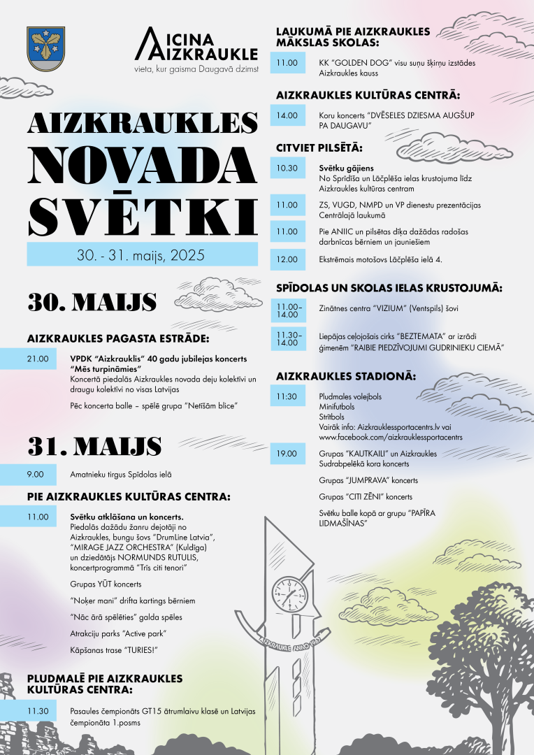 Aizkraukles novada svētki 2025. gadā norisināsies 30. un 31. maijā ar daudzveidīgu un krāšņu programmu visai ģimenei. Svētki sāksies ar deju kolektīvu koncertu un balli, bet turpināsies ar svinīgu atklāšanu, amatnieku tirdziņu, koncertiem, sporta aktivitātēm un izrādēm bērniem. Apmeklētājus priecēs gan vietējie, gan viesmākslinieki, tostarp grupas “Jumprava” un “Citi Zēni”. Svētku kulminācijā paredzēta balle un koncerts ar grupu “Papīra lidmašīnas”.