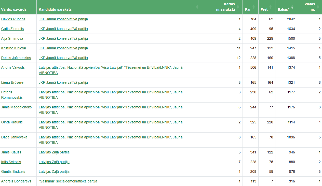 No 15 deputātu vietām piecās mandātus ieguvusi līdzšinējā valdošā partija, trīs – Latvijas Zaļā partija, bet vienu vietu – “Saskaņas” līderis Andrejs Bondarevs. Uzvarējuši jaunpienācēji – Jaunā konservatīvā partija, kuras saraksta līderis – 2001. gadā dzimušais Dāvids Rubens – ieguvis vairāk nekā 2000 balsu.