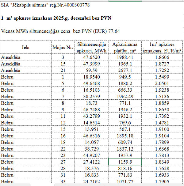 SIA “Jēkabpils siltums” publicējis informāciju par apkures izmaksām decembrī. Vienas megavatstundas siltumenerģijas cena decembrī bija 77,64 eiro bez PVN, savukārt vidējās apkures izmaksas pilsētā sasniedza 1,80 eiro bez PVN par vienu kvadrātmetru.