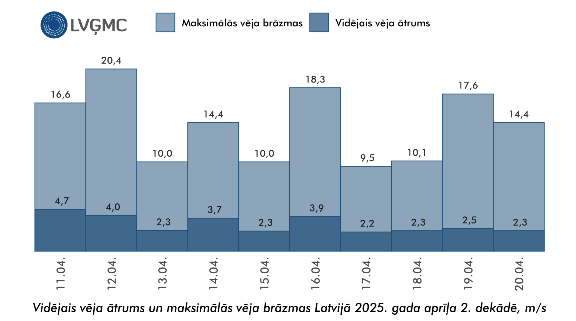 Visstiprākās vēja brāzmas (20,4 metri sekundē) tika novērotas 12. aprīlī Ventspilī.
