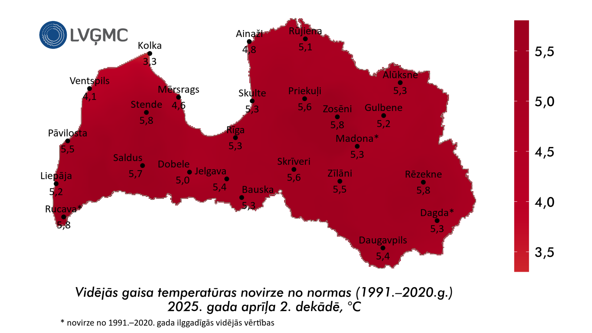 Aprīļa otrās dekādes vidējā gaisa temperatūra Latvijā sasniedza +10,9 grādus jeb 5,2 grādus virs daudzu gadu vidējā rādītāja, liecina Latvijas Vides, ģeoloģijas un meteoroloģijas centra apkopotā informācija.