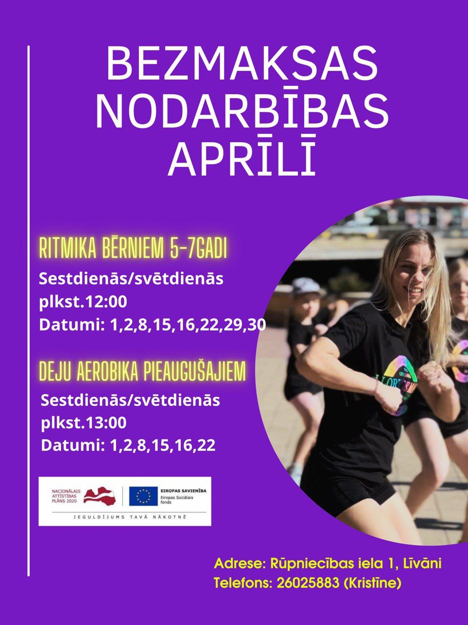 Līvānos aprīļa mēnesī būs iespēja apmeklēt bezmaksas nodarbības. Bērniem vecumā no pieciem līdz septiņiem gadiem būs ritmika, kas notiks, sākot no 1.aprīļa, sestdienās un svētdienās pulksten 12:00. Savukārt pieaugušajiem būs deja aerobika, kas notiks, sākot no 1.aprīļa, sestdienās un svētdienās pulksten 13:00. Nodarbību norises vieta būs Rūpniecības ielā 1, Līvānos.