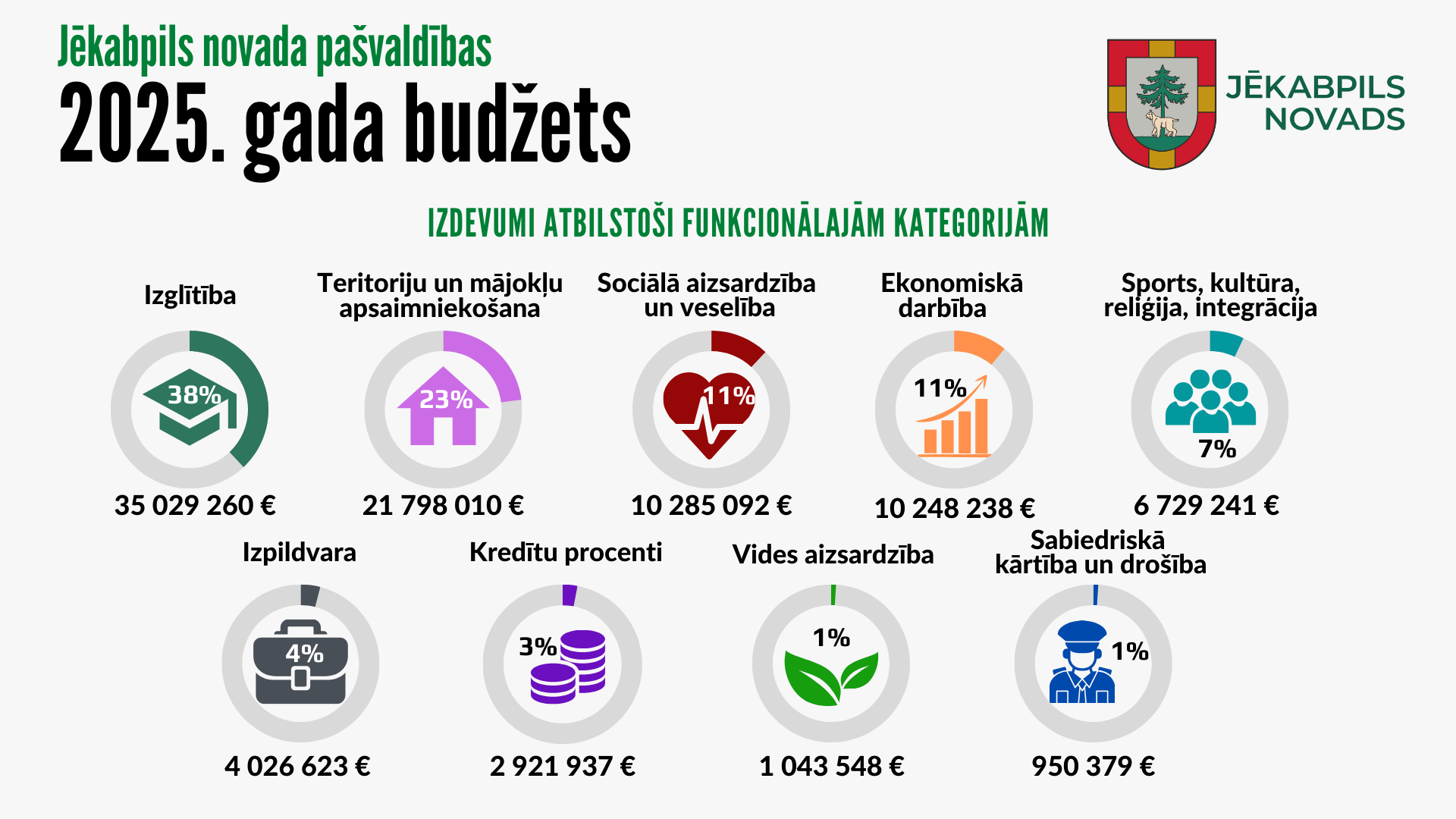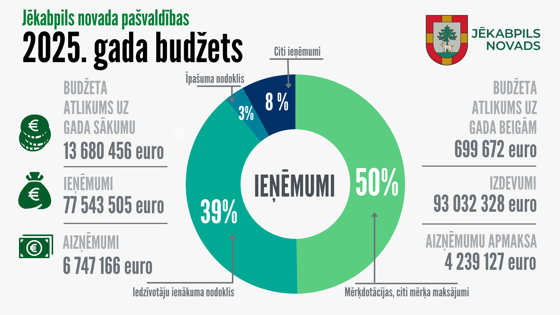 13. februāra Jēkabpils novada domes sēdē apstiprināts Jēkabpils novada pašvaldības 2025. gada budžets. Šogad ieņēmumu sadaļa veido aptuveni 77,5 miljonus eiro, savukārt izdevumu sadaļa sastāda 93 miljonus eiro.
