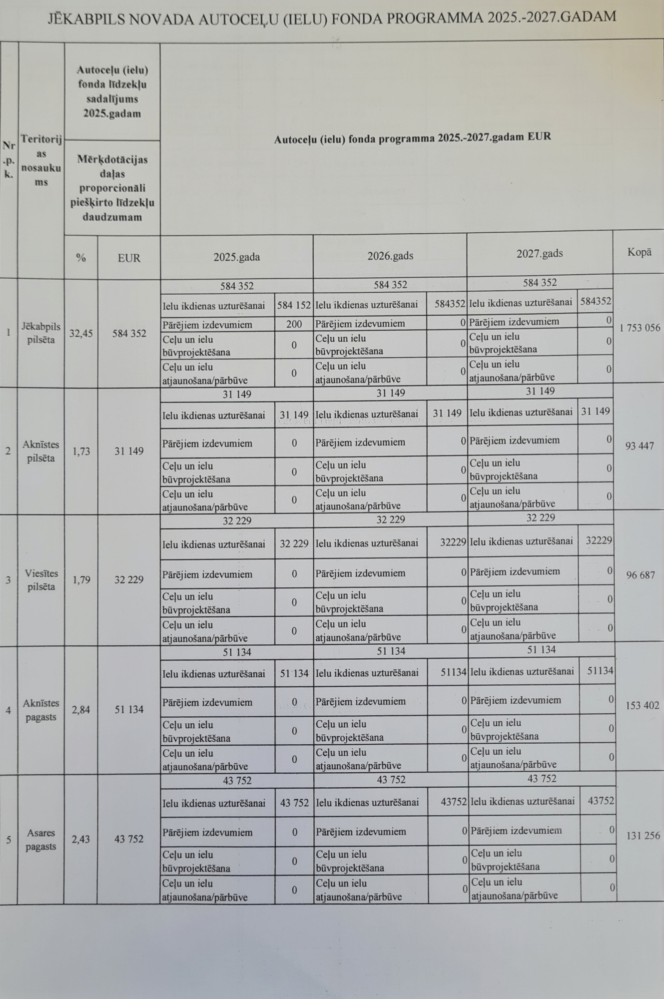 Jēkabpils novada domes sēdē apstiprināta Jēkabpils novada autoceļu (ielu) fonda programma 2025. – 2027. gadam. Tā paredz valsts piešķirto līdzekļu sadalījumu ielu un autoceļu ikdienas uzturēšanas darbiem, piemēram, bedrīšu remontam, greiderēšanai, atputekļošanai, apauguma noņemšanai, ceļa zīmju nomaiņai un citiem darbiem. Šim gadam piešķirtie līdzekļi ir 1,8 miljoni eiro. Tas ir nedaudz mazāk nekā pagājušajā gadā.