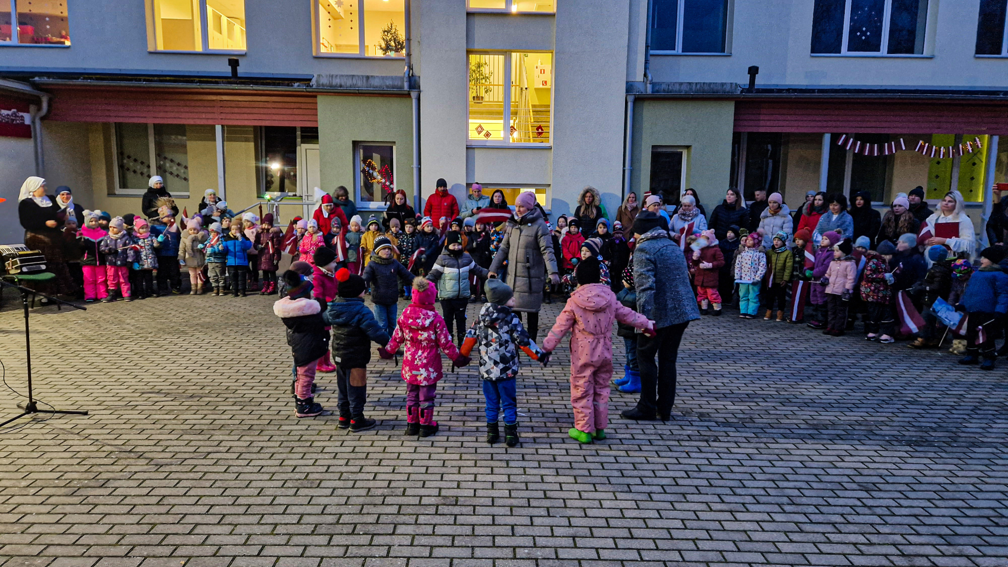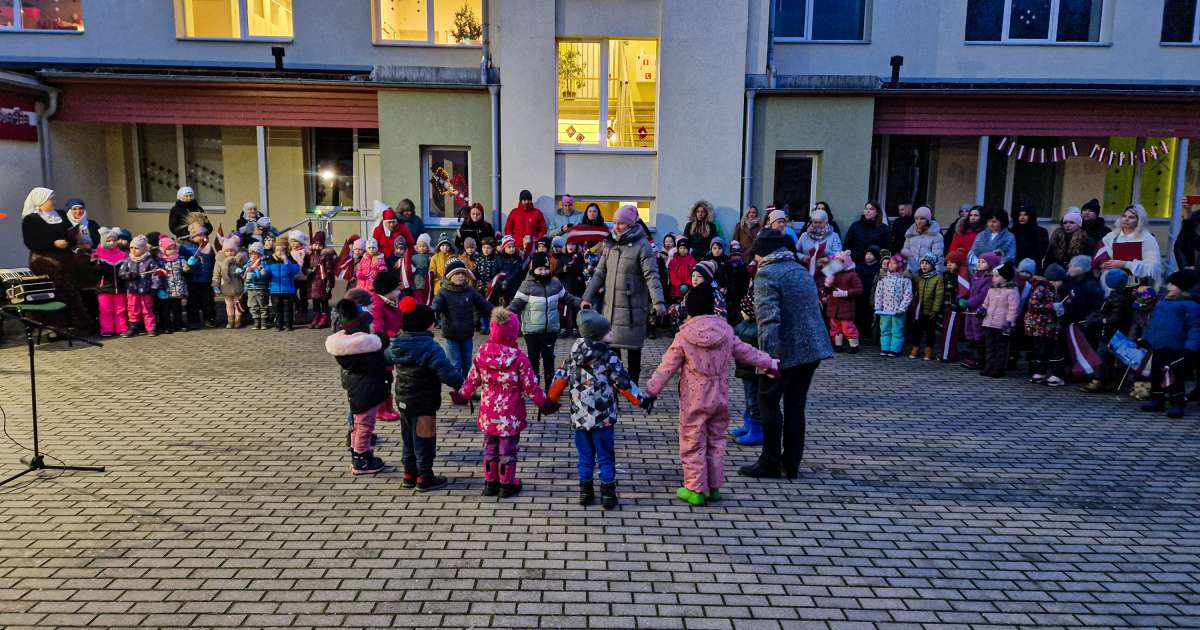 “Mēs katru gadu uzticam kādai no grupām vadīt pasākumu tieši par godu Latvijas dzimšanas dienai. Šoreiz piekrita “Zirnīšu” grupa. Tie ir bērni vecumā no pieciem līdz sešiem gadiem kopā ar savām skolotājām,” skaidro bērnudārza “Kāpēcītis” vadītājas vietniece izglītības jomā Ineta Aizporiete.