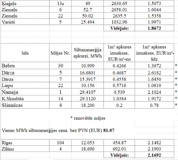 Daudzdzīvokļu ēkās, kurās apkuri nodrošina vietējās mazās katlu mājas, vienas megavatstundas cena novembrī bija 81,07 eiro bez PVN. Šajā kategorijā augstākās apkures izmaksas reģistrētas Zīlānu ielā 4, bet zemākās – Rīgas ielā 104.