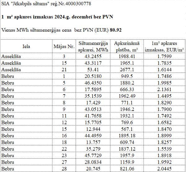 SIA “Jēkabpils siltums” ir publicējusi informāciju par apkures izmaksām decembra mēnesī. Vienas megavatstundas siltumenerģijas cena šajā mēnesī bija 80,92 eiro bez PVN. Savukārt vidēji par viena kvadrātmetra apsildīšanu iedzīvotājiem nācās maksāt 1,86 eiro bez PVN, kas ir par 32 centiem vairāk nekā novembrī, kad šī summa bija 1,54 eiro bez PVN.