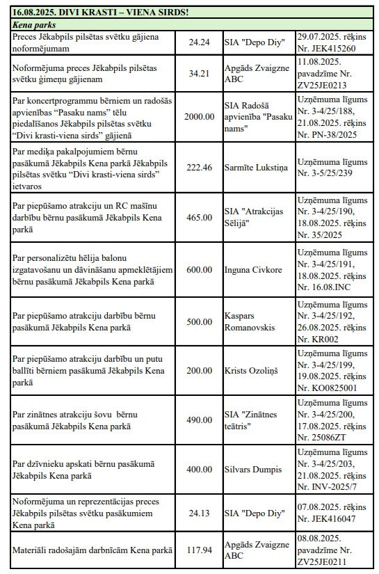 Šogad Jēkabpils pilsētas svētki ar moto “Divi krasti – viena sirds” norisinājās nedēļas garumā – no 9. līdz 16. augustam. Kopējās svētku izmaksas sasniegušas gandrīz 88 tūkstošus eiro, un dārgākā pozīcija bijis svētku lielkoncerts.