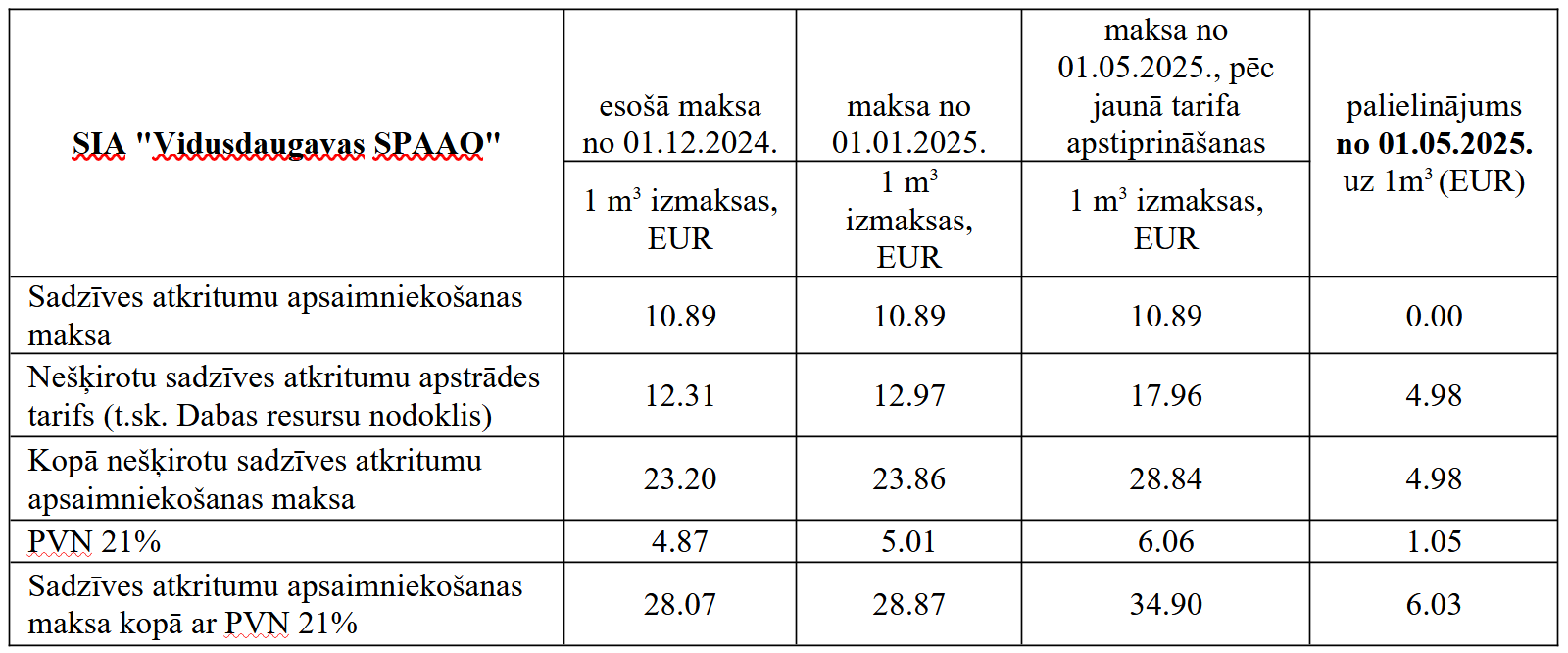 SIA “Vidusdaugavas SPAAO” ir sagatavojusi un iesniegusi Sabiedrisko pakalpojumu regulēšanas komisijai (turpmāk - SPRK) tarifa projektu par nešķirotu sadzīves atkritumu apstrādi AARC “Dziļā vāda”. Plānots, ka jaunais AARC “Dziļā vāda” nešķirto sadzīves atkritumu apstrādes tarifs varētu stāties spēkā no 2025.gada 1.maija.