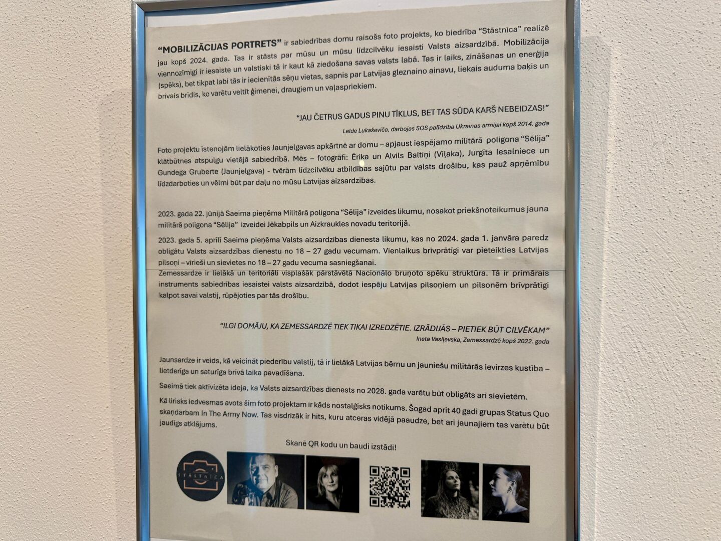 “Jaunieši mobilizējas skolā un jaunsardzē, sievietes mobilizējas, ne tikai pinot tīklus un palīdzot Ukrainai, bet arī adot zeķes un vārot ievārījumu. Man ir arī stāsts par zemessardzi, un jaunieši, puiši, kuri jau ir pakļauti dienestam,” teic Jurgita Iesalniece. “Šī izstāde radīta, lai palīdzētu pierast un mazinātu trauksmi. Lai saprastu, ka tie ir tie paši mūsu cilvēki.”