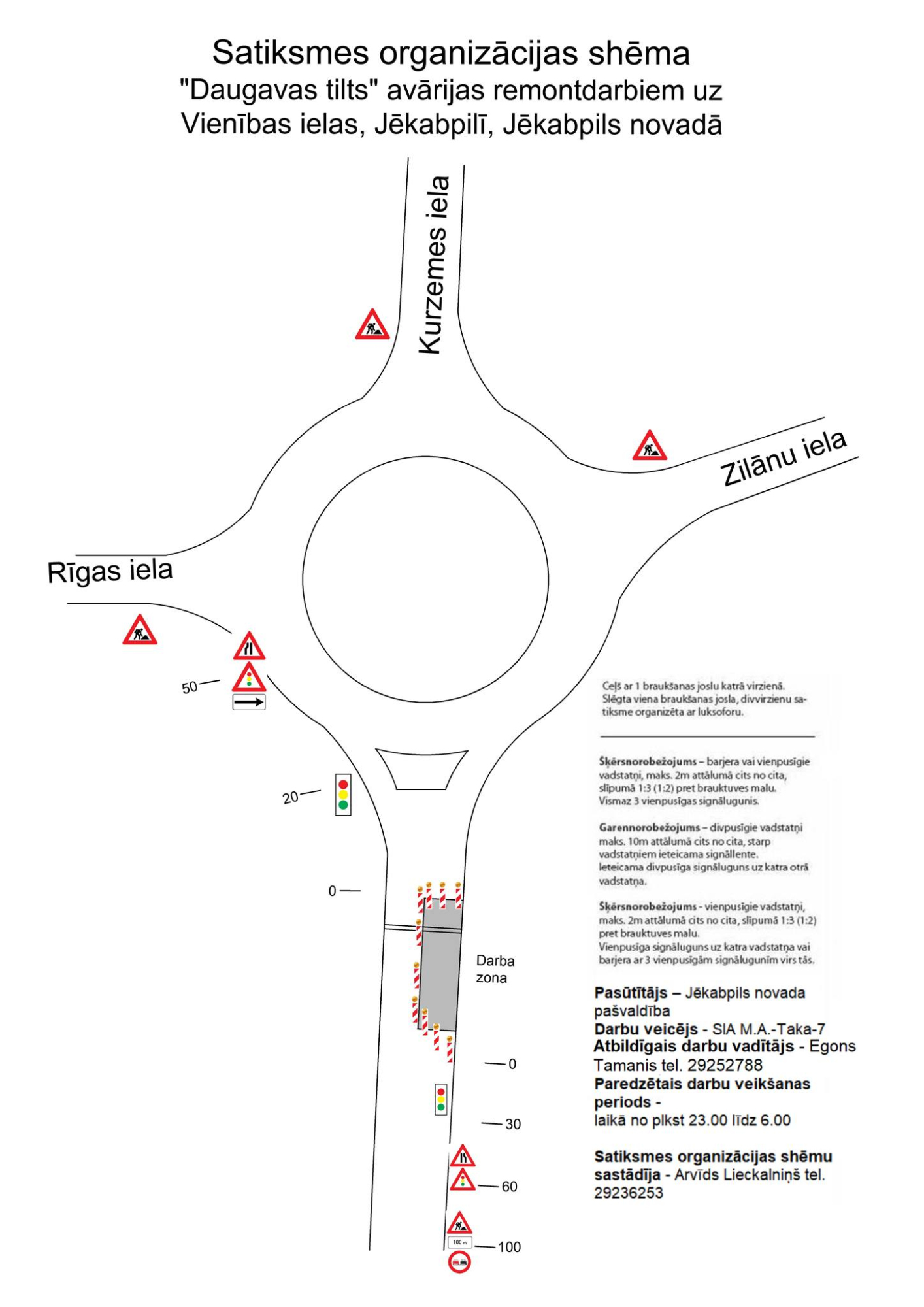 Nākamajā pirmdienā, 4.decembrī, Jēkabpilī sāksies tilta pār Daugavu šuves remonts. Tiks remontēta šuve, kas atrodas tuvāk Daugavas labajam krastam, jo tā šobrīd ir vissliktākajā stāvoklī. Darbi noritēs nakts stundās – no pullksten 23:00 līdz 6:00, lai pēc iespējas mazāk traucētu transporta plūsmu. Darbu laikā satiksme tiks organizēta pa vienu braukšanas joslu, un kustību regulēs luksofors. Darbus veiks SIA “M.A.-TAKA-7” – tas ir uzņēmums, kas jau pagājušajā gadā remontēja vienu Jēkabpils tilta šuvi. Paredzēts, ka metāla šuve tiks nomainīta pret mīksto šuvi. Tieši tādā pašā tehnoloģijā pagājušā gada novembrī tika remontēta šuve tuvāk Daugavas kreisajam krastam.