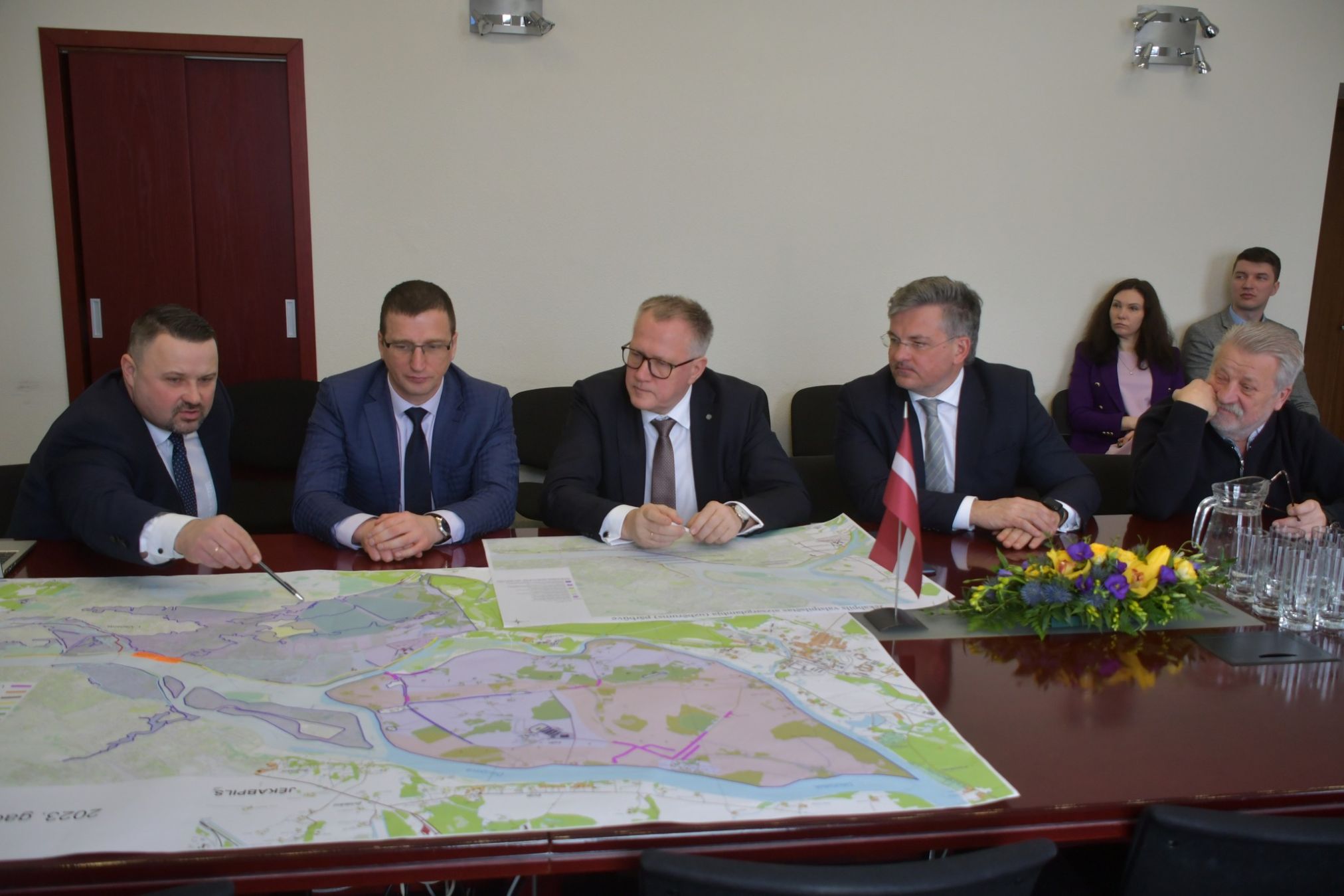 30.martā Jēkabpils novada pašvaldību apmeklēja finanšu ministrs Arvils Ašeradens un ministra padomnieks budžeta jautājumos Ints Dālderis. Ar domes vadību tika pārrunāti iespējamie finansēšanas avoti Daugavas aizsargdambja rekonstrukcijai un pārbūvei, kā arī iespēja aizsargdambim piešķirt nacionālo interešu objekta statusu, kas ļautu paātrināt finansējuma piesaisti būvdarbiem. Šajā gadā plānotajiem dambja pārbūves darbiem nepieciešami aptuveni 7,6 miljoni eiro, bet kopējais dambja atjaunošanai nepieciešamais finansējums divu gadu laikā ir aptuveni 12,4 miljoni eiro. Finanšu ministrs atzina, ka ministrija ir gatava sniegt palīdzību, atbalstot Vides aizsardzības un reģionālās attīstības ministrijas sagatavoto ziņojumu valdībai par Eiropas Savienības fondu un nacionālā līdzfinansējuma piešķiršanu steidzamības kārtā. Ministrs, ministra padomnieks un domes vadība arī apsekoja aizsargdambi un Sakas salu.