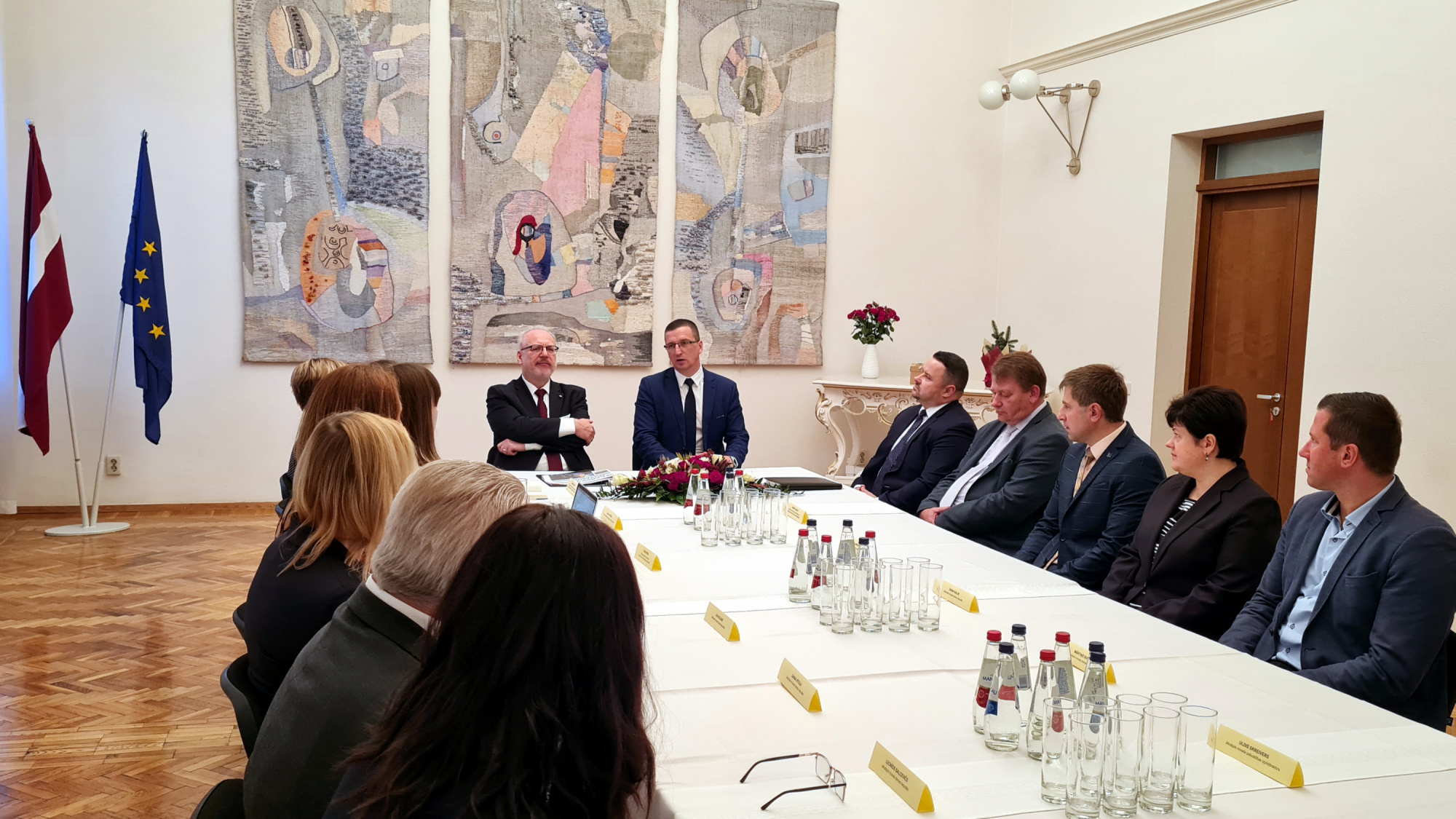 Tikšanās noslēgumā Egils Levits pasniedza domes priekšsēdētājam Raivim Ragainim oficiāli apstiprināto un parakstīto Jēkabpils novada ģerboni. Valsts heraldikas komisija apstiprinājusi jauno Jēkabpils novada identitātes simbolu – ģerbonī attēlota zaļa egle sudraba laukā, priekšā ejošs lūsis dabiskās krāsās, bet apmale ir sarkana, dalīta ar zelta krustu.