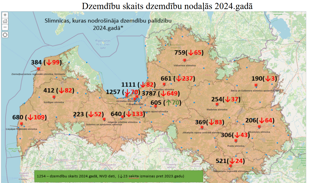 Grūtniecību un dzemdību aprūpi Latvijā nodrošina 17 stacionārās ārstniecības iestādes. Gandrīz visās ir vērojams dzemdību skaita samazinājums. Izņēmums ir Ogres rajona slimnīca, kurā 2024. gadā bija par 70 dzemdībām vairāk nekā iepriekšējā gadā.