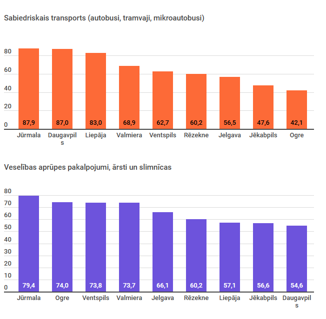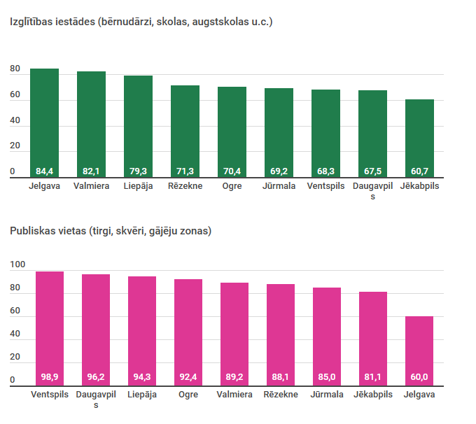 Īpaši izceļas iedzīvotāju vērtējums par izglītības iestādēm. Jelgavā ar bērnudārziem, skolām un augstskolām apmierināti 84,4% iedzīvotāju, Valmierā 82,1%, Liepājā 79,3%, savukārt Jēkabpilī šis rādītājs ir viszemākais starp aptaujātajām pilsētām — 60,7%. Arī Daugavpilī tas ir salīdzinoši zems — 67,5%.