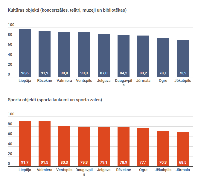 Arī sporta objektu vērtējumā Jēkabpils būtiski atpaliek no līderiem. Liepājā ar sporta laukumiem un sporta zālēm apmierināti 91,7% iedzīvotāju, Valmierā — 91,5%, kamēr Jēkabpilī šis rādītājs ir vien 68,8%.