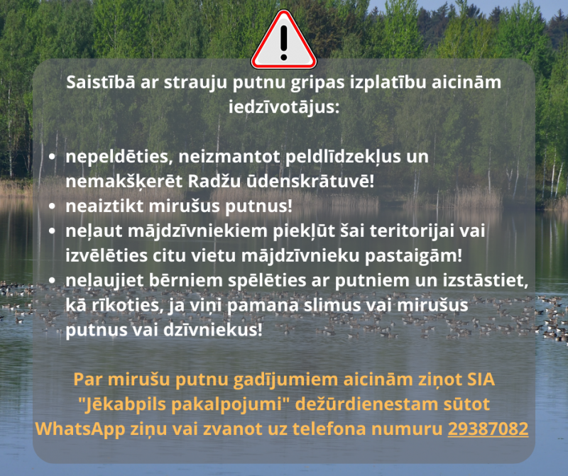 “Ir izsludināts brīdinājums iedzīvotājiem netuvoties putniem, ja tie guļ zemē,” stāsta Jēkabpils novada domes priekšsēdētājs Raivis Ragainis. “Uzmanīgi ar saviem mājdzīvniekiem, nevajadzētu ar viņiem pastaigāties pa šo teritoriju. Tāpat ir ļoti svarīgi atcerēties, ka putnu, kas ir apdullis un staigā, nevajadzētu ņemt un mēģināt mājās ārstēt, jo tas nav iespējams. Šī gripa cilvēkam tiešā saskarē arī var būt bīstama.”