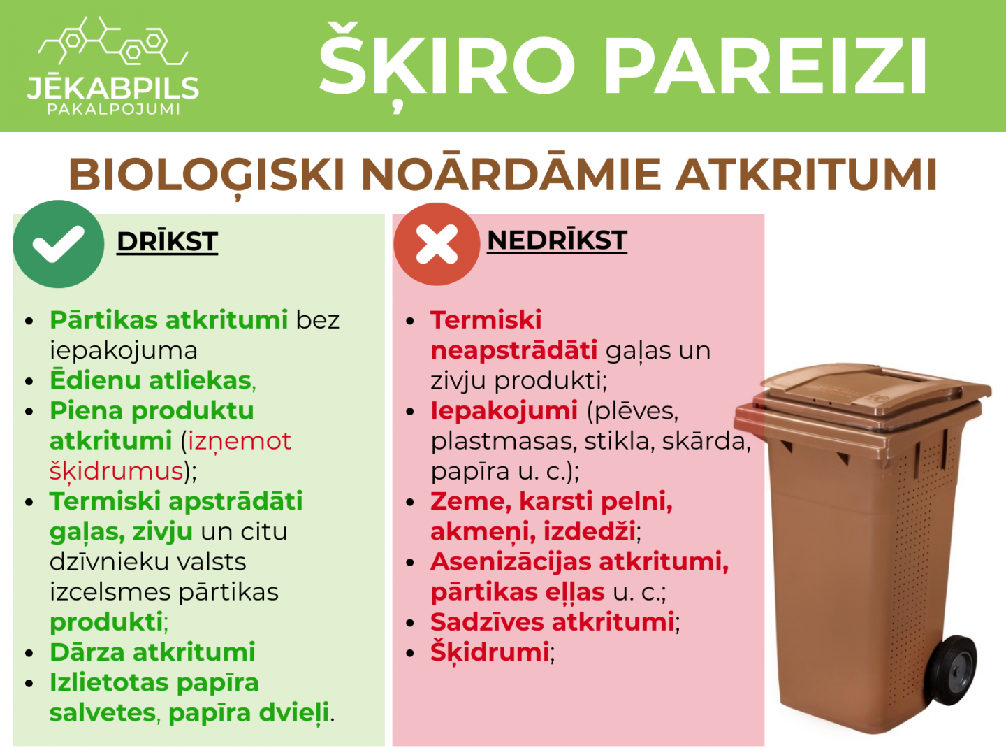 Atgādinām: brūnajos konteineros drīkst mest pārtikas atkritumus bez iepakojuma, ēdienu atliekas, piena produktu atkritumus, izņemot šķidrumus, termiski apstrādātus gaļas un zivju produktus, dārza atkritumus un izlietotas papīra salvetes. Savukārt tajos nedrīkst mest termiski neapstrādātus gaļas un zivju produktus, iepakojumus, zemi, akmeņus, pelnus, izdedžus, asenizācijas atkritumus, sadzīves atkritumus un šķidrumus.