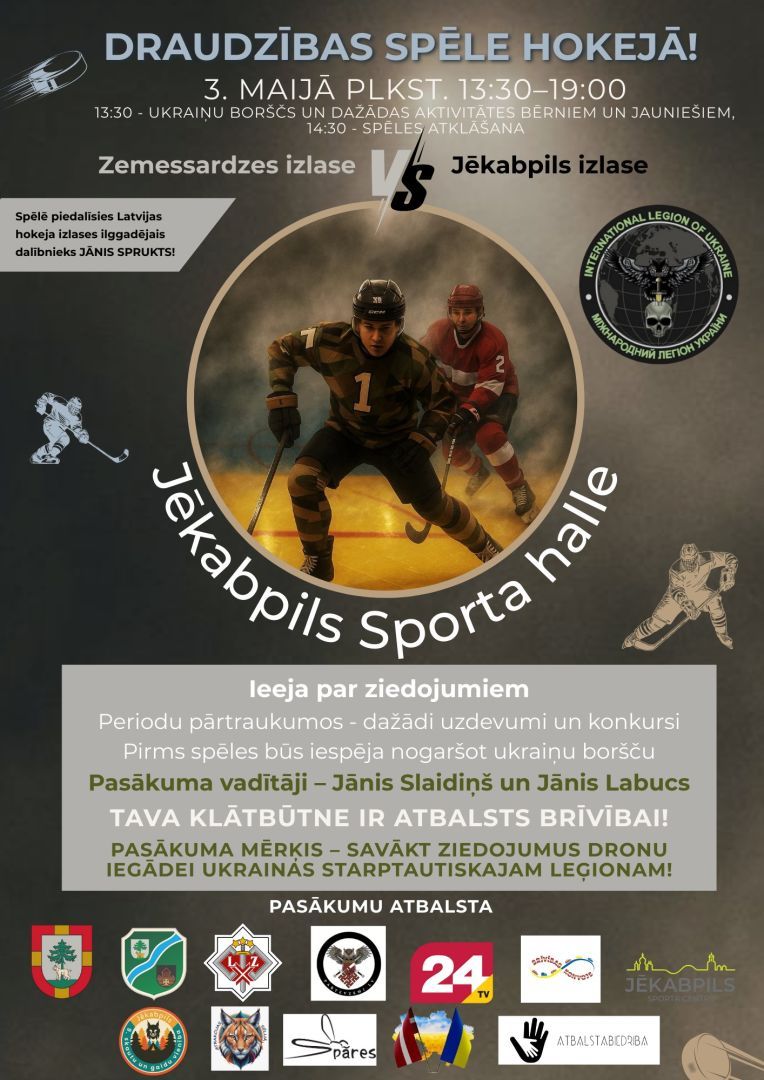 Sestdien, 3. maijā, no pulksten 13.30 līdz 19.00 Jēkabpils Sporta halles ledus arēnā norisināsies īpaša draudzības spēle hokejā starp Zemessardzes izlasi un Jēkabpils izlasi. Spēlē piedalīsies arī Latvijas hokeja izlases ilggadējais dalībnieks Jānis Sprukts.