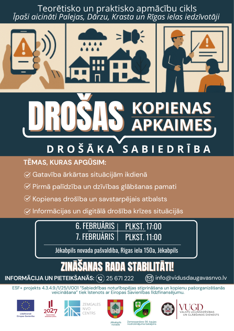 Jēkabpilī tiek organizēts teorētisko un praktisko apmācību cikls “Drošas kopienas – drošāka sabiedrība”, kura mērķis ir stiprināt iedzīvotāju zināšanas un prasmes drošības jomā. Īpaši aicināti piedalīties Palejas, Dārzu, Krasta un Rīgas ielas iedzīvotāji.