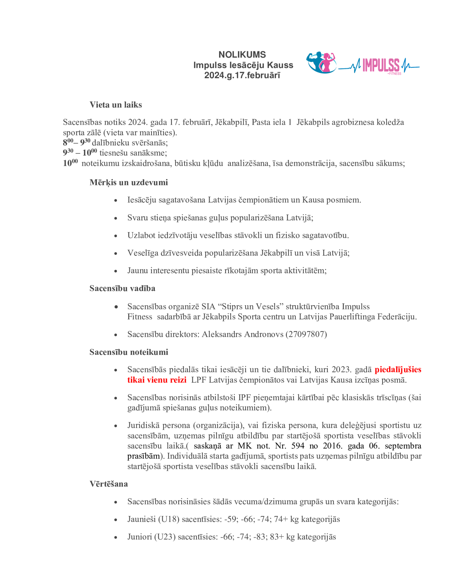 “Impulss Fitness” sadarbībā ar Jēkabpils Sporta centru un Latvijas Pauerliftinga Federāciju organizē sacensības svaru stieņa spiešanā guļus “Iesācēju Kauss”. Sacensības notiks nākamā gada 17.februārī Jēkabpils Agrobiznesa koledžas (no 2024.gada 1.janvāra – Jēkabpils Tehnoloģiju tehnikums) sporta zālē. “Iesācēju Kauss” ir notikums, kur savā starpā sacenšas nevis pieredzējuši sportisti, bet iesācēji. Sacensībās drīkst piedalīties tikai iesācēji un tie dalībnieki, kuri 2023.gadā tikai vienu reizi piedalījušies LPF Latvijas čempionātos vai Latvijas Kausa izcīņas posmā. Paralēli sacensībām notiks arī citas fiziskas aktivitātes, kurās varēs piedalīties ikviens interesents. Pieteikties var līdz nākamā gada 16.februārim. Sīkāka informācija par sacensību noteikumiem un pieteikšanos pieejama nolikumā:
