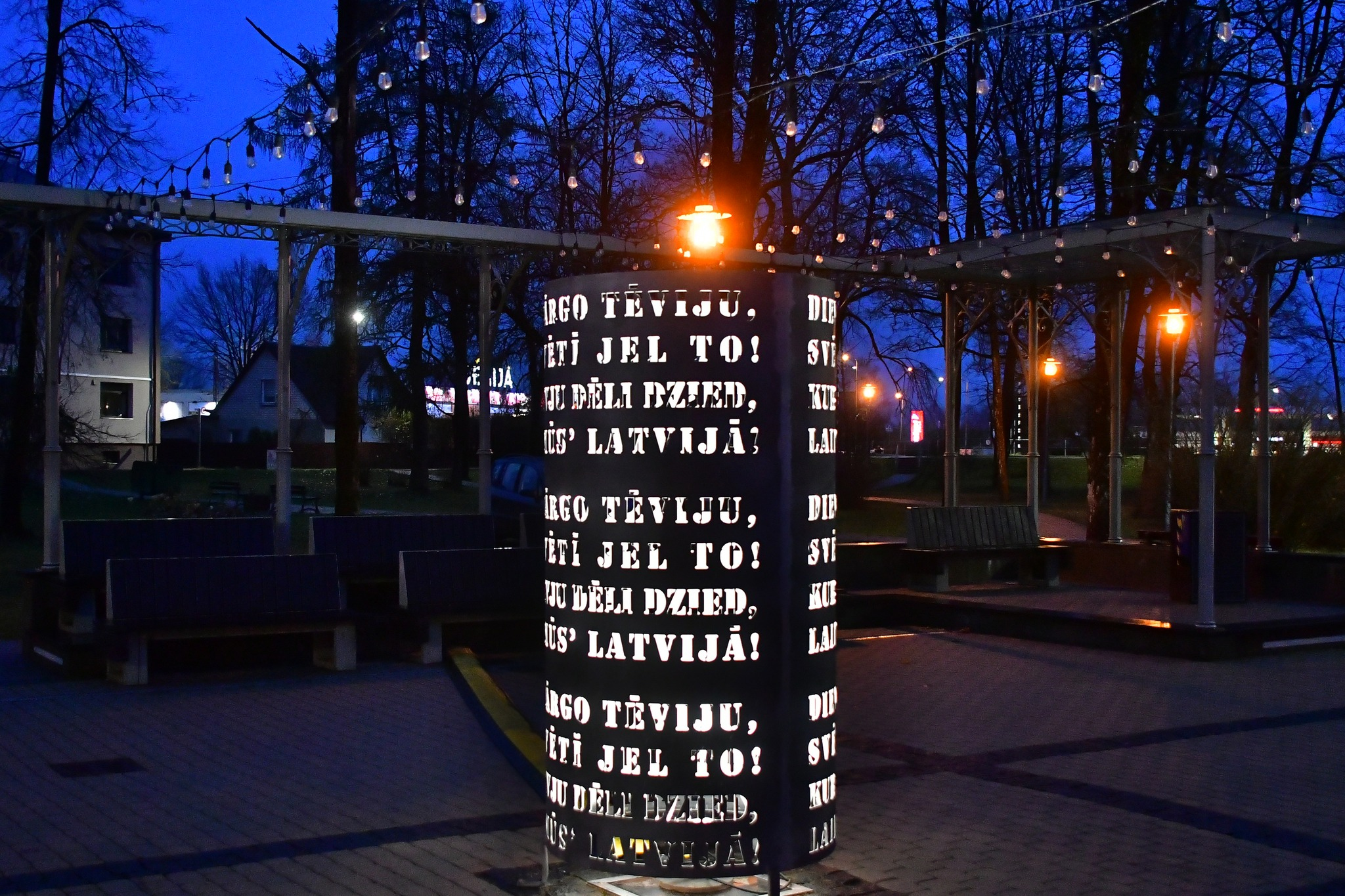 Kena parka estrādē, Jēkabpilī, ir uzstādīta vides instalācija “Par saules pielieto pilsētu pie upes...”. Jēkabpils novada Kultūras pārvalde informē, ka instalācija un gaismas objekts būs skatāms no 17.līdz 20.novembrim katru vakaru no pulksten 17:00 līdz 21:00. Instalācija ir veltījums Jēkabpils novada iedzīvotājiem un viesiem Valsts svētkos. Lai izbaudītu pilnu gaismas un skaņas instalācijas ciklu, pastaigai parkā būs nepieciešamas aptuveni 30 minūtes. Tāpat par godu Valsts svētkiem Jēkabpils novada Kultūras pārvaldes komanda sadarbībā ar metālmākslinieku Valēriju Konstantinovu sarūpējusi Kena parka estrādē gaismas objektu, kuru rotā Latvijas valsts himnas vārdi. Arī šo objektu varēs apskatīt līdz 20.novembra pulksten 21:00.