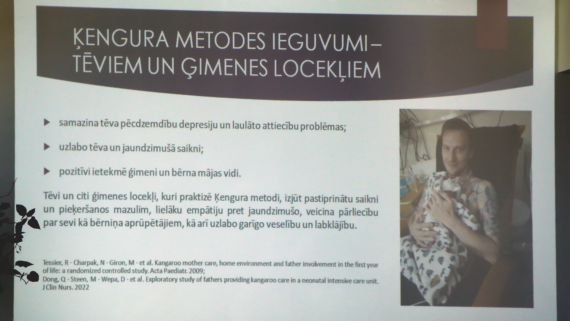 “Kad bērniņš piedzimst priekšlaikus, vecāki nav sagatavojušies, viņi jau nav ieguvuši kaut kādas zināšanas,” stāsta Bērnu klīniskās universitātes slimnīcas Jaundzimušo intensīvās terapijas nodaļas māsa Anita Puķe. “Tas, ko mēs viņiem iedodam un pastāstām, arī ir tas, ko viņi zina. Mēs jau uzreiz uzrunājam viņus: “Kad mēs plānojam “iet ķengurā”, kad jūs varēsiet?” Mums tā ir ikdiena Bērnu slimnīcā.”