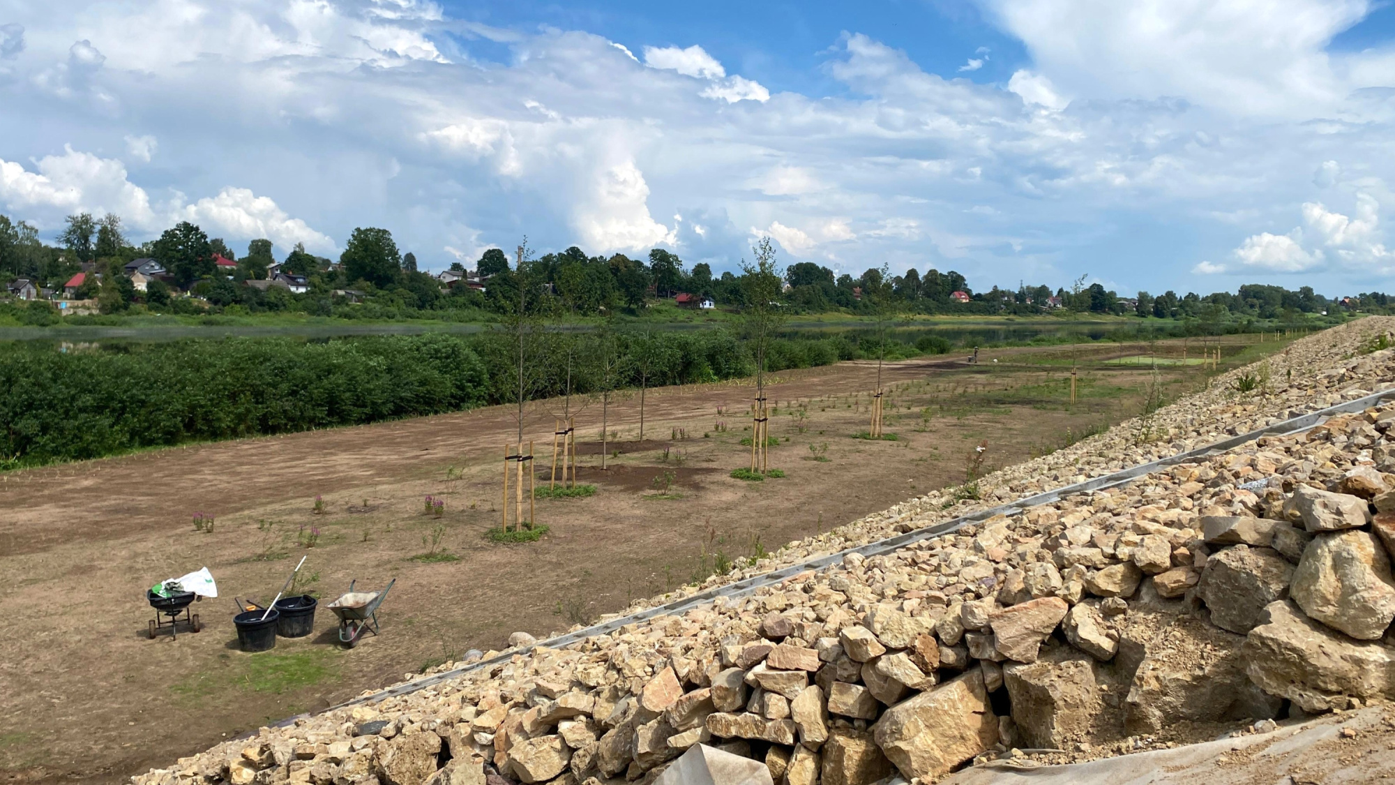 Divas teritorijas, kur iedzīvotāji jau var novērtēt dambja plānojumu, ir pie Sakas tilta un aiz tilta uz Daugavpils pusi, kur izveidoti fitoremediācijas lauki. Tajos paredzēts izvietot gan koka laipas, gan solus un citus elementus, kas plānoti sezonāli un būs pārnēsājami. Tāpat šajās teritorijās izveidoti apstādījumi – brašas bērzu rindas.