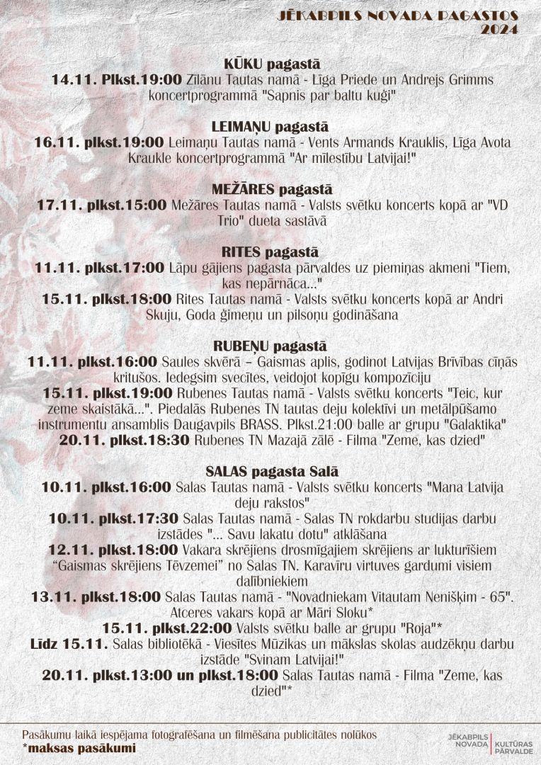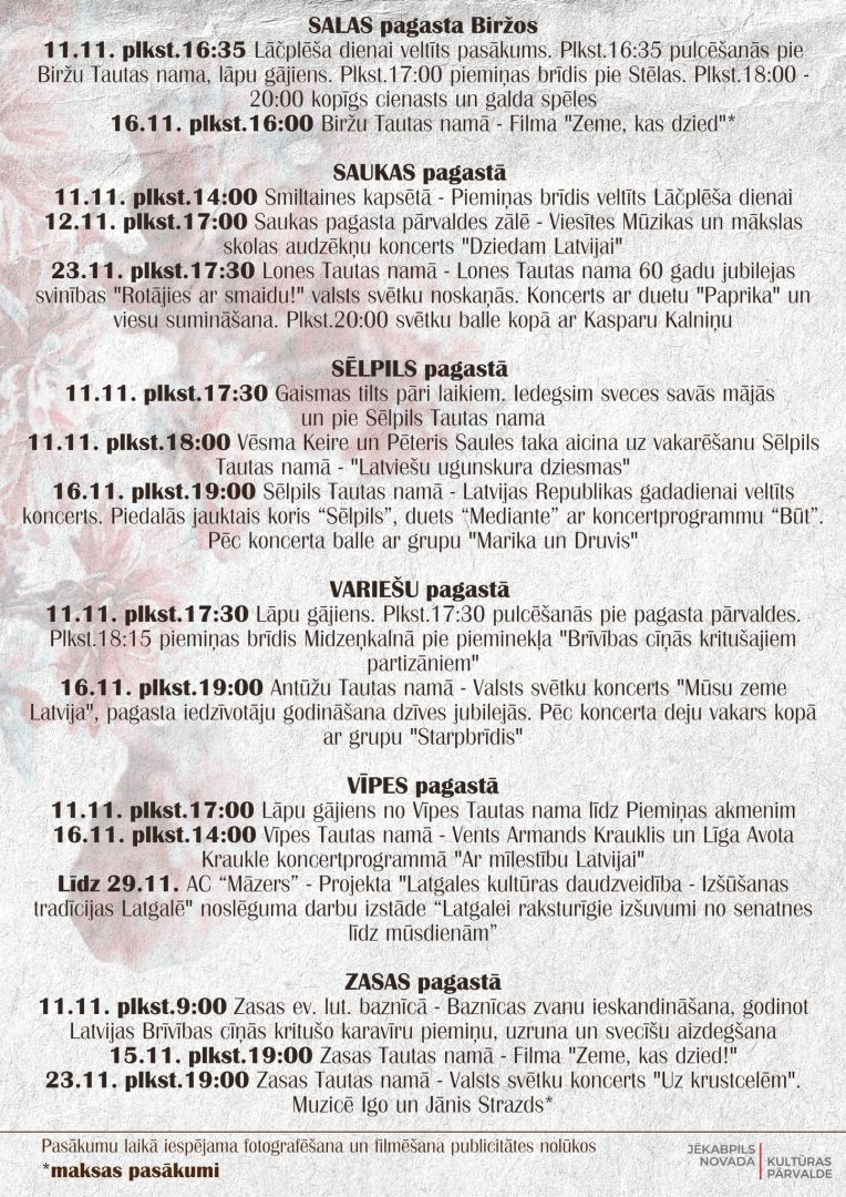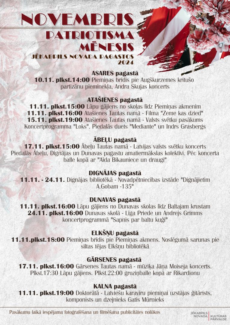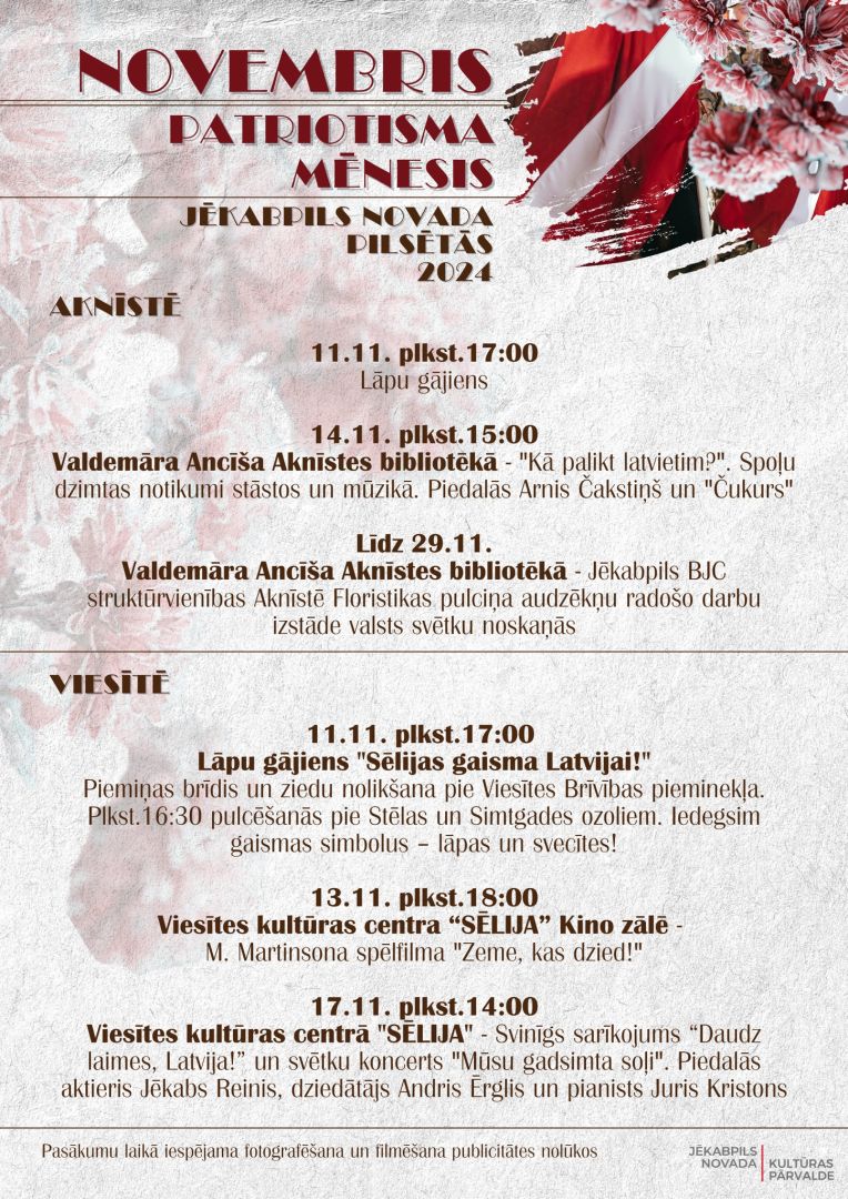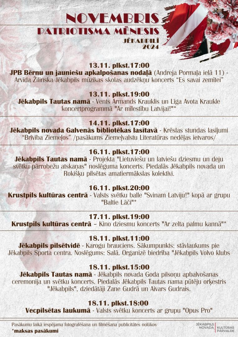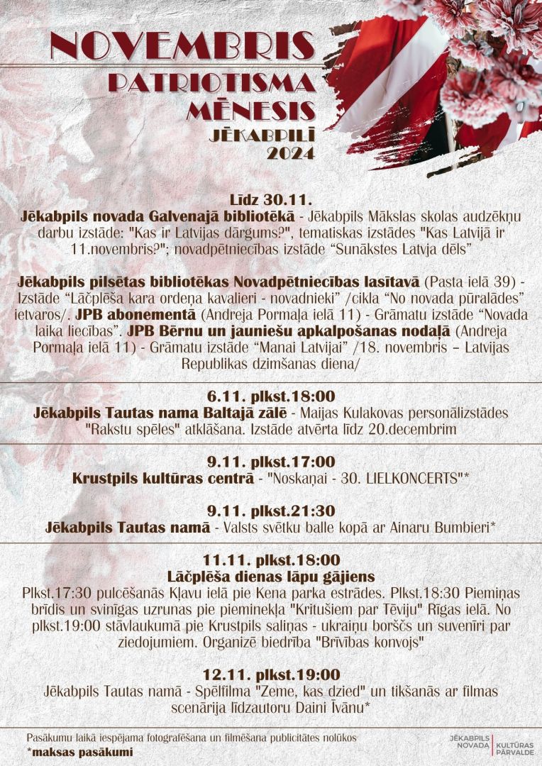 Novembris Latvijā ik gadu tiek iekrāsots sarkanbaltsarkanās krāsās. Katrs ciems, pagasts un pilsēta rīko dažādus pasākumus, lai svinētu Latvijas 106. jubileju un Lāčplēša dienu. Šogad Jēkabpils novadā ir plānoti pasākumi, kas nodrošinās, ka ikviens var atrast sev piemērotāko un sirdij tuvāko aktivitāti.