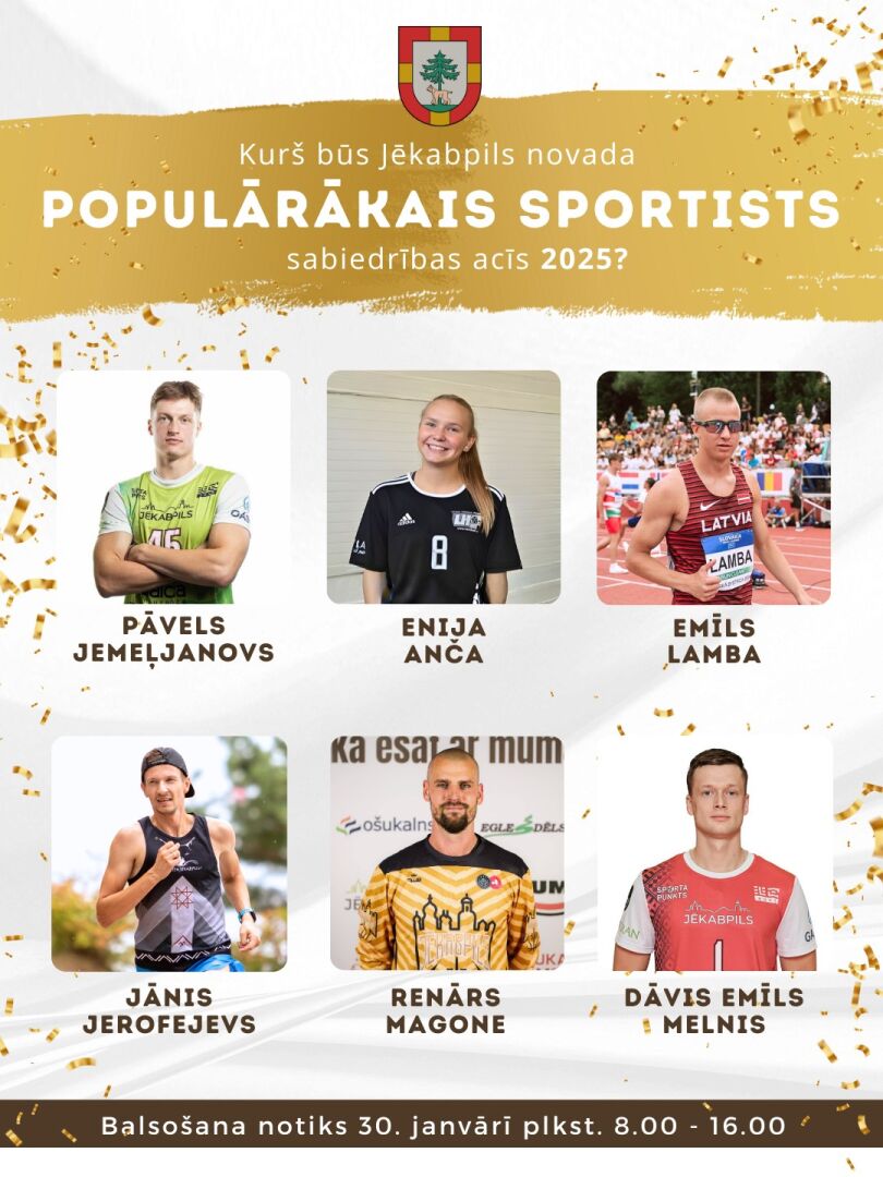 Piektdien, 30. janvārī, no pulksten 8.00 līdz 16.00 Jēkabpils Sporta centra Facebook lapā notiks balsojums par 2025. gada populārāko Jēkabpils novada sportistu sabiedrības acīs.