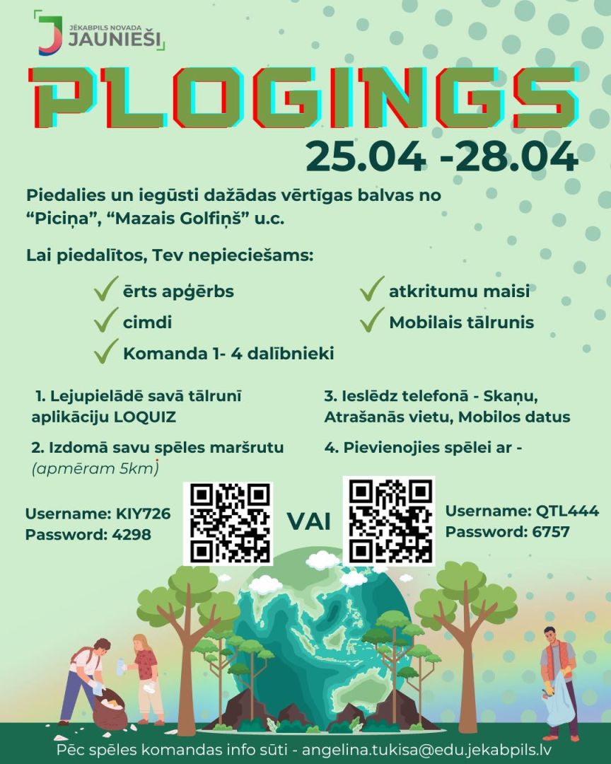 Jēkabpils novada jaunieši vecumā no 13 līdz 25 gadiem aicināti piedalīties vides akcijā “Skrien zaļi Jēkabpils novadā”. Akcijas dalībnieki no 25. līdz 28. aprīlim var izmēģināt plogingu – videi draudzīgu skriešanas veidu, kur jāsavāc atkritumi skriešanas laikā.
