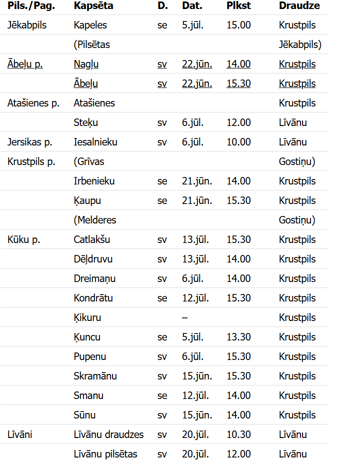 Latvijas evaņģēliski luteriskās baznīcas Krustpils draudze informē par 2025. gada kapusvētku grafiku šim gadam. Sarakstā ir plānotie kapusvētku norises laiki daudzās luterāņu draudžu kapsētās Jēkabpils un Līvānu novadā. Pirmie kapusvētki norisināsies 14. jūnijā. Programma regulāri tiek papildināta ar jaunu informāciju, tādēļ aktualitātēm var sekot līdzi: ŠEIT.