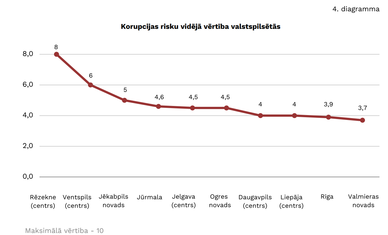 Vērtējot 10 punktu sistēmā, visaugstākos korupcijas riskus KNAB saskata Rēzeknes būvvaldē (8 punkti), Jēkabpils novads ar 5 punktiem ierindojas trešajā vietā, bet viszemākie riski konstatēti Valmieras novadā (3,7 punkti).