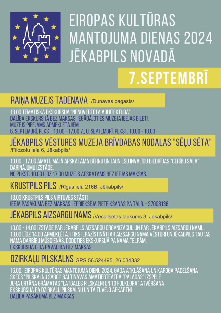 Šogad Eiropas kultūras mantojuma dienas norisināsies no 6. līdz 8. septembrim. Tās veltītas kultūras mantojuma pieejamībai un drošībai. Uzmanība pievērsta trim galvenajiem virzieniem – kultūras mantojuma publiskajai pieejamībai, piekļūstamībai cilvēkiem ar funkcionāliem traucējumiem un drošībai, kas ietver arī sabiedrības atbildību un zināšanas par kultūras vērtību saglabāšanu. Tēmu atspoguļošanai speciālisti izvēlējušies 66 kultūras pieminekļus vai to grupas visā Latvijā. Zemgalē būs pieejami 16 objekti, pieci no tiem atrodas Jēkabpils novadā.