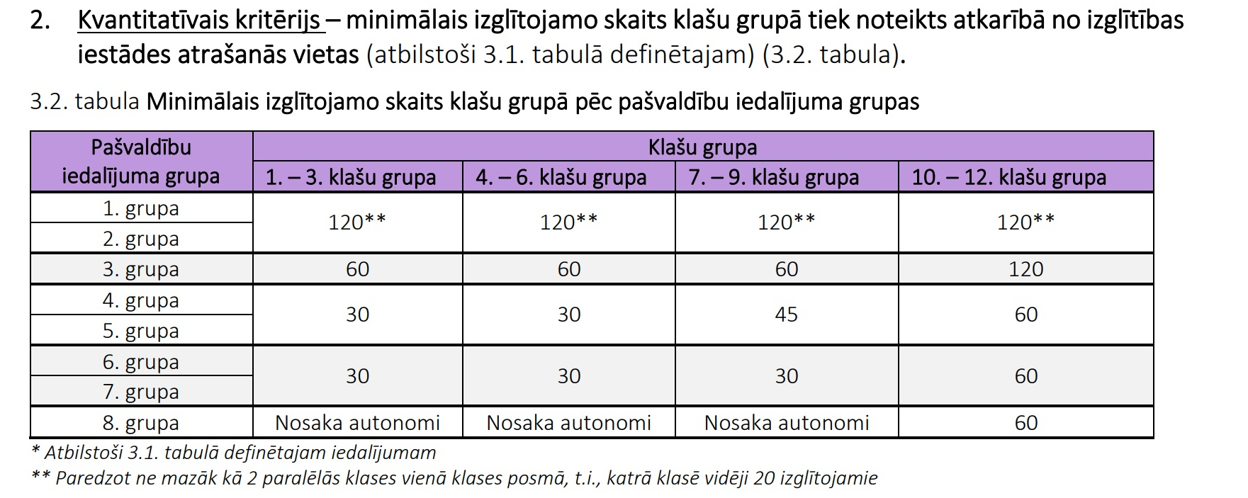 Jēkabpils novada Izglītības pārvaldes vadītāja pienākumu izpildītāja, Aknīstes vidusskolas direktore Aija Voitiške informē par minimālo skolēnu skaitu klašu grupās: “1.-3.klašu grupā jābūt 30 skolēniem, kur ir retāk apdzīvotas teritorijas, bet pilsētā tie ir 120 skolēni. Kritēriji 4.-6.klašu grupā ir 30 lauku teritorijās un 120 – pilsētās. Būtiskas izmaiņas sākas ar 7.-9.klašu grupu, kur pašvaldībās atkarībā no iedzīvotāju blīvuma minimālajam skolēnu skaitam jābūt 30, 45, 60 vai 120. Vidusskolu grupā pilsētas teritorijā jābūt 120 skolēniem, laukos – 60 skolēniem. Lai šos kritērijus sasniegtu, tas novadā ir ļoti liels izaicinājums, jo atbilstoši tam tiek noteikts programmas finansējums, no kura izriet arī pedagogu darba samaksa.”