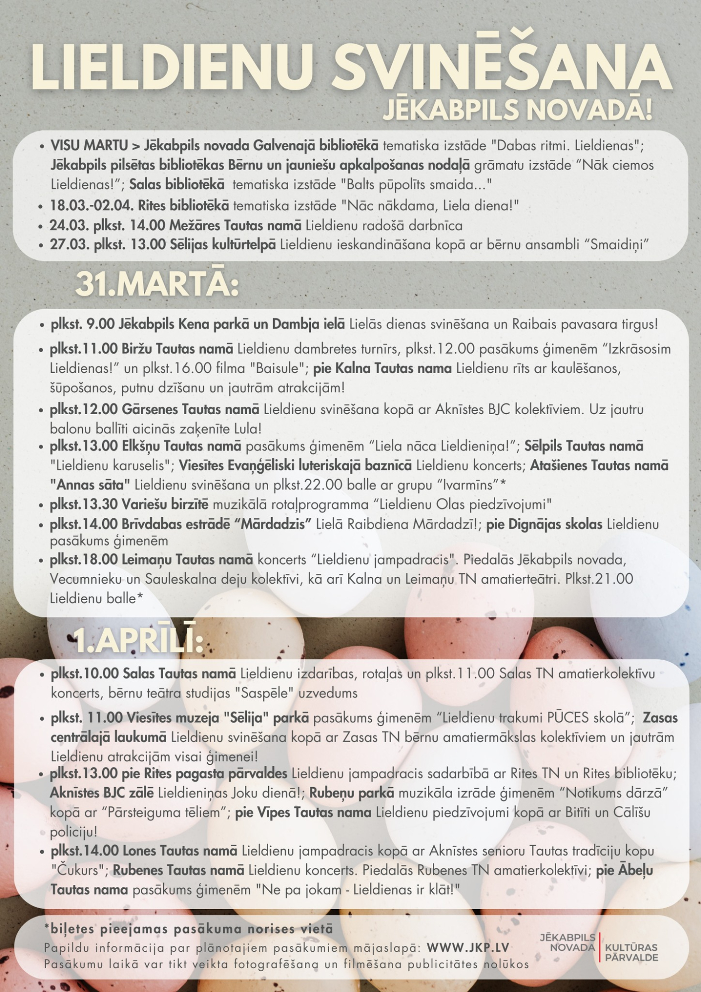 Lieldienu pasākums Jēkabpils pilsētā notiks 31.martā no pulksten 9:00 līdz 15:00, un tas tiks organizēts Kena parkā. Programmā paredzēts pavasara tirgus, namdara darbnīca, olu krāsošana un ripināšana, izjādes ar zirgiem, šūpošanās, dažādas sportiskas aktivitātes, kā arī amatiermākslas kolektīvu koncerts.