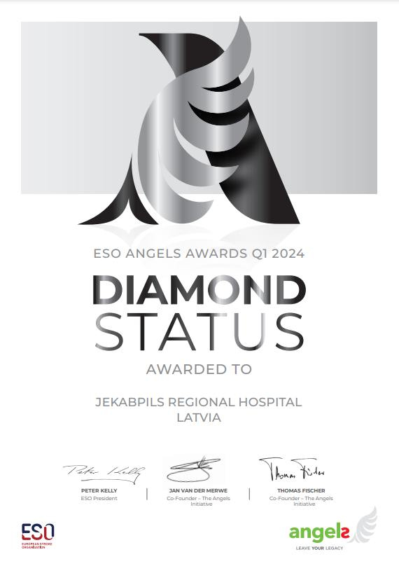 Jēkabpils reģionālās slimnīcas Neiroloģijas nodaļas Insulta vienība ir saņēmusi augstu apbalvojumu – starptautiskās insulta organizācijas Eņģeļu apbalvojuma “ESO Angels Awards” Dimanta līmeni. Tas ir augstākais šī apbalvojuma līmenis. “ESO Angels Awards” ir starptautisks kvalitātes atzinības novērtējums Insulta vienības profesionālajai darbībai. Nozīmīgais statuss Jēkabpils Insulta vienībai tika piešķirts 10. Eiropas Insulta organizācijas konferencē.