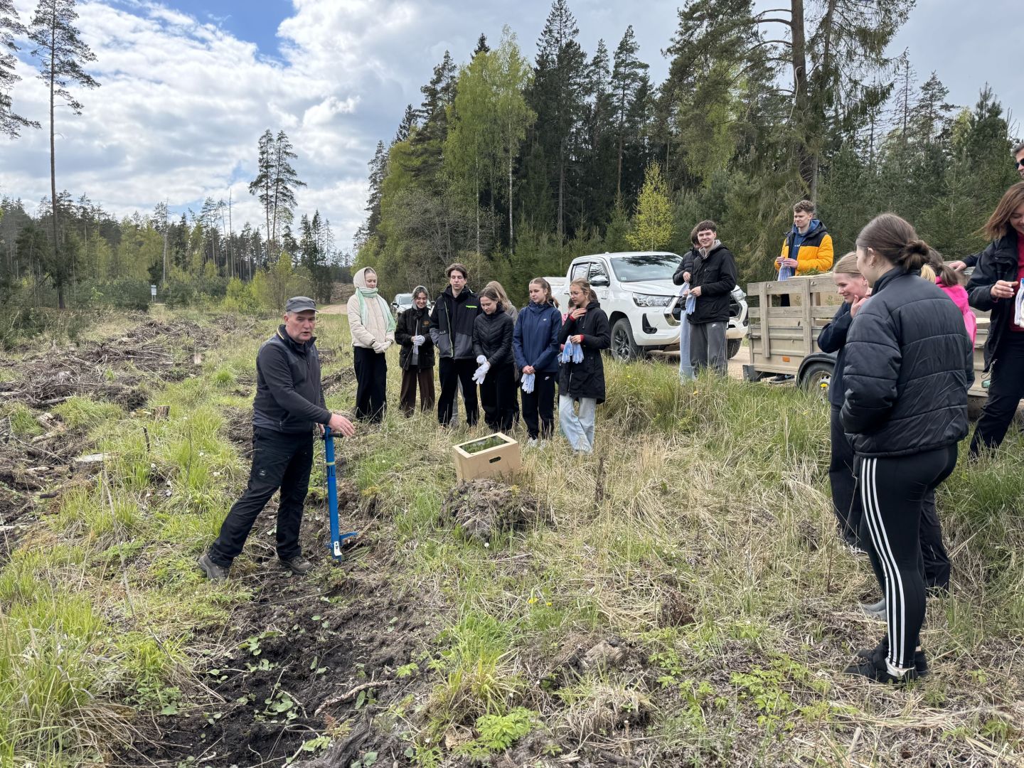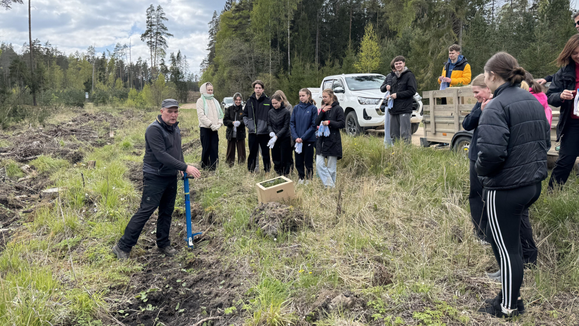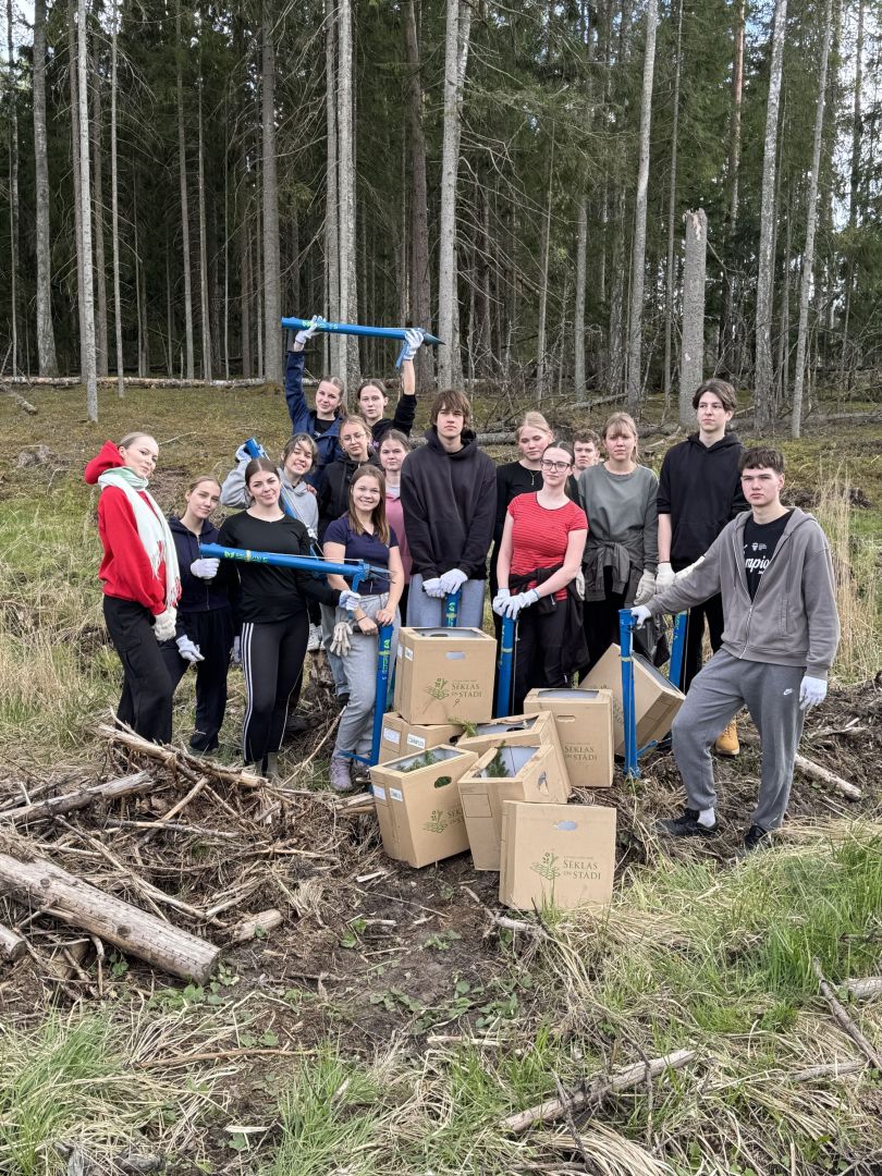Jēkabpils Valsts ģimnāzijas 10.b klases skolēni kopā ar audzinātāju Dagniju Kalniņu devās uz Latvijas Valsts mežu teritoriju Kūku pagastā, lai piedalītos meža stādīšanas darbos. Skolēni iestādīja priedītes 0,7 hektāru platībā