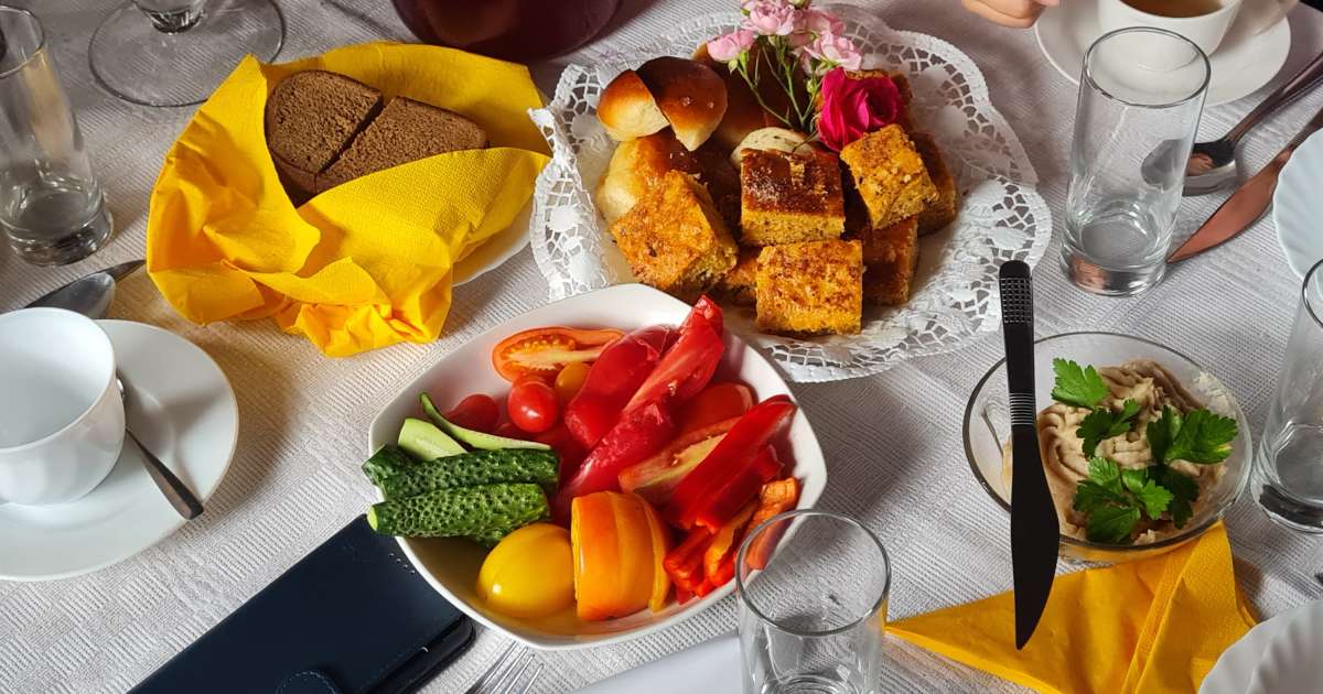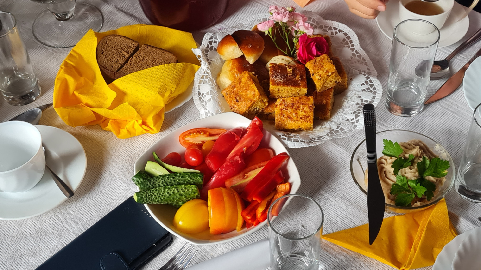 Saimnieces teikto apliecina bagātīgi klātais galds, uz kura bija svaigu kāpostu zupa, putraimu zupa ar tomātiem un burkāniem, miežu biezputra ar apceptiem dārzeņiem, dažādu veidu salāti, burkānu kekss un daudzi citi ēdieni. Maltītes laikā klātesošie varēja iepazīt vēl vienu vecticībnieku tradīciju – pamācību lasīšanu no īpašas grāmatas.