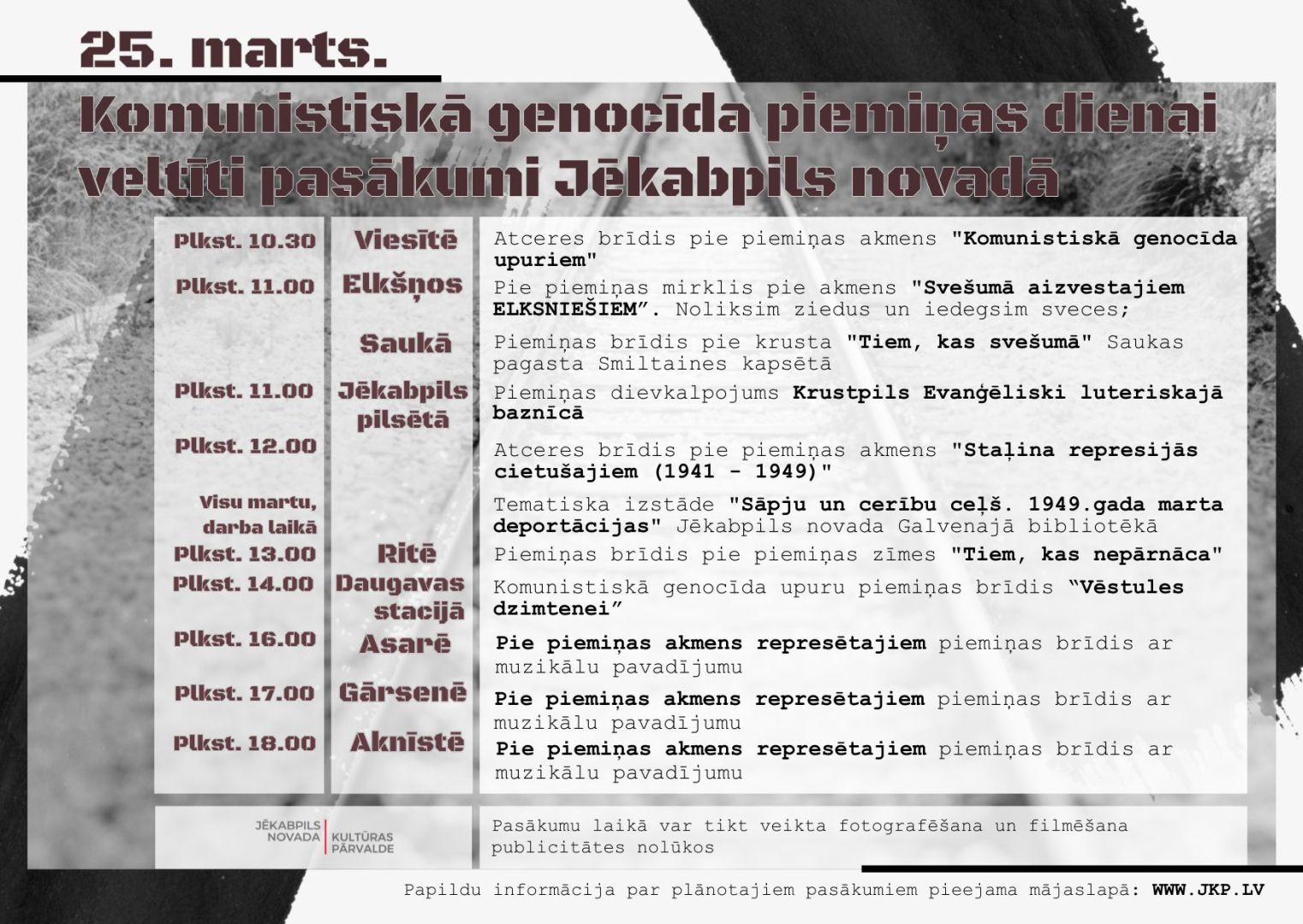 Jēkabpils novadā 25.martā notiks komunistiskā genocīda upuru piemiņas dienai veltītie pasākumi, lai atcerētos un pieminētu 1949. gada deportācijas un komunistiskā genocīda upurus.