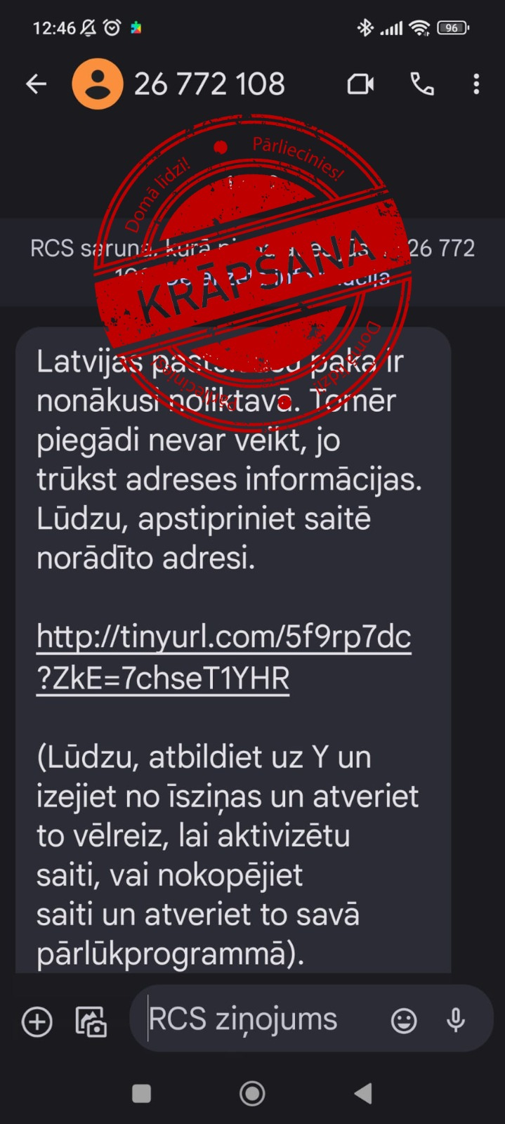 Valsts policija aicina nevērt vaļā šādām īsziņām pievienotās aizdomīgās saites, kas nesakrīt ar iestāžu oriģinālajām adresēm, un neievadīt apšaubāmās vietnēs savus internetbankas un personas datus, kā arī neapstiprināt maksājumus.