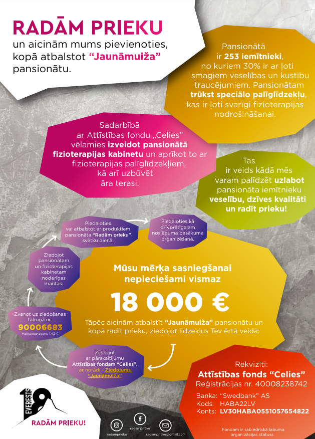 Pansionātā “Jaunāmuiža” savu ikdienu aizvada 253 klienti, 30 procentiem no viņiem ir smagi veselības un kustību traucējumi. Fizioterapijai ir būtiska loma šo cilvēku veselības uzlabošanā, bet iestādei trūkst šim mērķim nepieciešamo speciālo palīglīdzekļu.